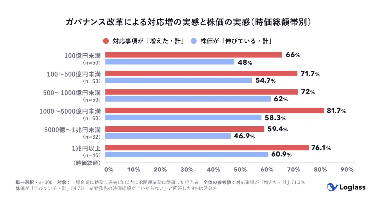 ガバナンス改革に伴い対応が増えたとの回答は7割を超す一方、株価が伸びているとの実感は50%前後にとどまる。負荷の重さと評価の実感は単純には連動しない。 |