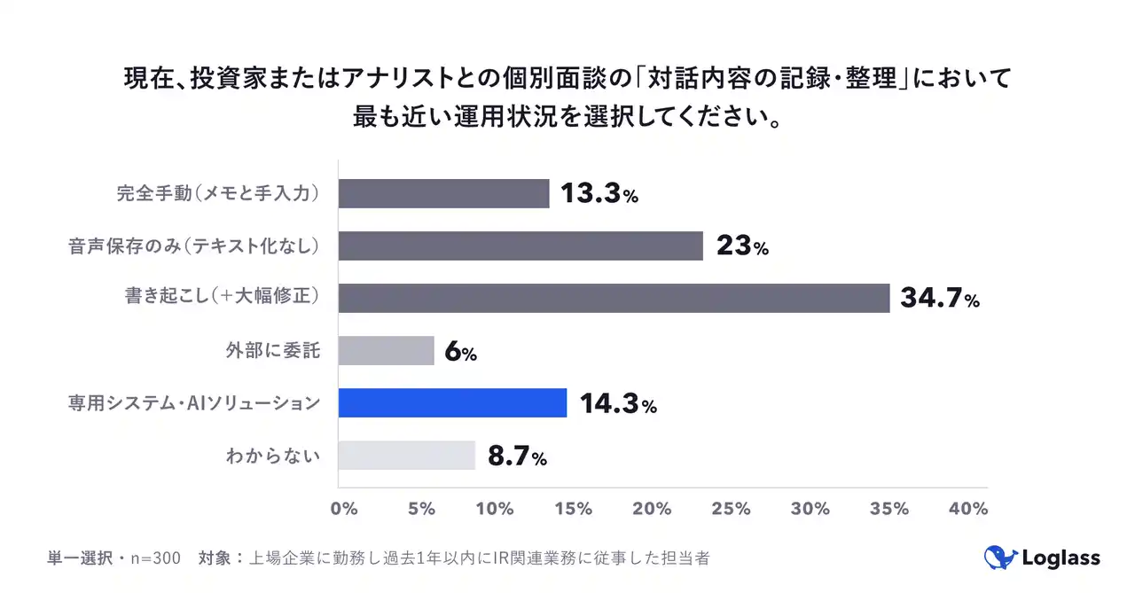 IR担当者が本来注力したい業務では経営戦略の提言(44.7%)とエンゲージメント強化(43.0%)が上位。一方で投資家との個別面談の記録・整理では、完全手動・音声のみ・書き起こし修正の合計で71.0%を占め、アナログ~半アナログの運用が目立つ。専用システム・AIを活用している企業は14.3%にとどまり、記録・整理に時間が取られやすい実態が重なる。 |