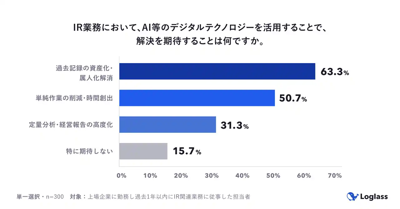 8割超のIR担当者が、AI・デジタルテクノロジーによる業務課題の解決を期待している。「過去記録の資産化・属人化解消」への期待が63.3%、「単純作業の削減・時間創出」への期待が50.7%。業務効率化だけでなく、対話の蓄積と活用が焦点になっている。 |