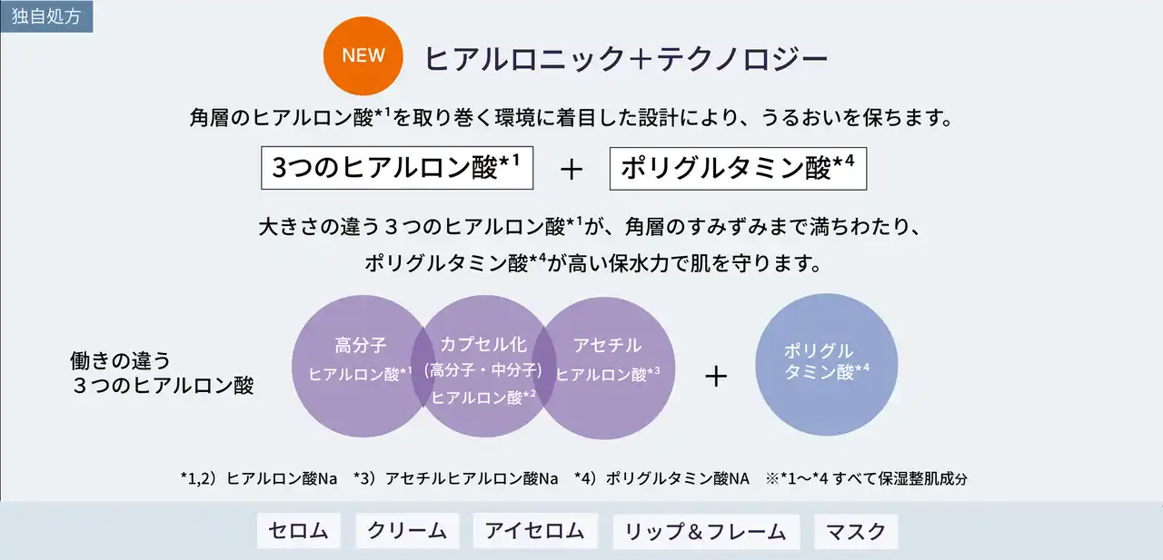 | 肌の中で水分を抱え込み、うるおいを支えるヒアルロン酸は、年齢を重ねるにつれてその量が減少するといわれています。エステダムは、この年齢変化による乾燥に着目。3種類のヒアルロン酸¹とポリグルタミン酸*³を組み合わせた独自処方 ”ヒアルロニック+テクノロジー” を採用し、シリーズをさらにパワーアップさせました。 | ||||||||||||||||