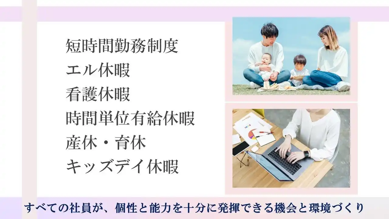 | 当社では、女性活躍推進に向けた主な取り組みとして、時間単位有給休暇、短時間勤務制度、エル休暇、看護休暇、キッズデイ休暇、産休・育休などの各種制度を整備しています。 | |||
