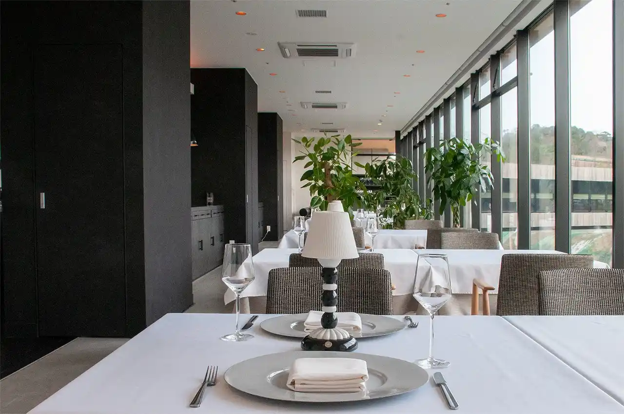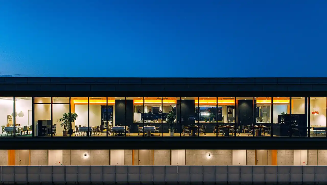 VISONは、多気町の自然豊かな山肌に沿って開かれた広大な敷地の中にあります。 その中でも最も高い位置にあるホテルの最上階(10階)に位置するのが、バスク交流レストラン「IZURUN[イスルン]」です。 |