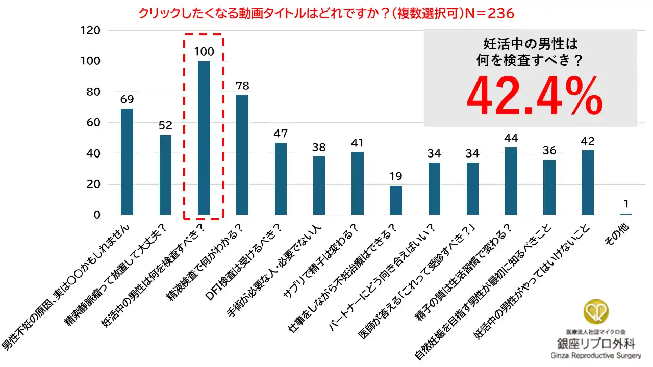 | 調査の結果、最も見てみたいテーマは「男性不妊の主な原因」(45.3%)、最もクリックしたくなる動画タイトルは「妊活中の男性は何を検査すべき?」(42.4%)でした。「不妊治療では、女性は産婦人科に相談する流れが一般的である一方、男性は情報が少なく何をしたらよいか分からない。YouTubeが情報収集のための“最初の一歩”になっている」(銀座リプロ外科・永尾光一)可能性が高いと言えます。 | |||