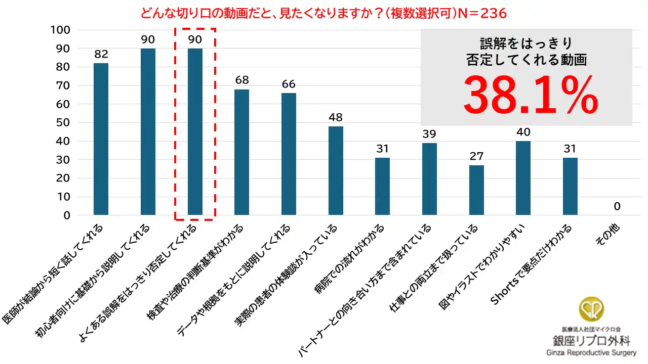 | また、「どんな切り口の動画だと、見たくなりますか」という質問では、「初心者向けに基礎から説明してくれる」38.1%(90人)、「よくある誤解をはっきり否定してくれる」38.1%(90人)、「医師が結論から短く話してくれる」34.7%(82人)、「検査や治療の判断基準がわかる」28.8%(68人)、「データや根拠をもとに説明してくれる」28.0%(66人)が上位となりました。 | |||