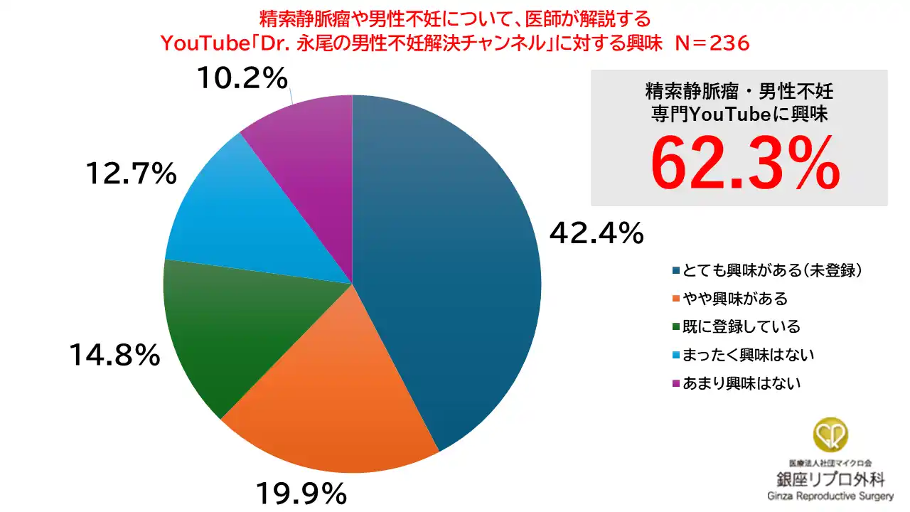 | また、医師が解説するYouTube「Dr. 永尾の男性不妊解決チャンネル」への関心については、「とても興味がある(未登録)」30.1%(71人)、「やや興味がある」29.2%(69人)、「既に登録している」14.8%(35人)で、合計74.2%(175人)が一定の関心を示しました。 | |||