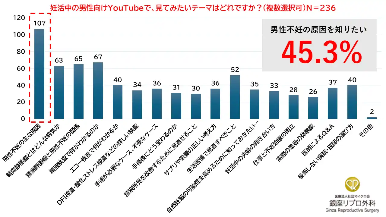 | 銀座リプロ外科は今回、妊活中または妊活予定の男性236人を対象に、男性不妊に関するYouTube動画について、どのような内容に関心があるのかを調査しました。まず、「妊活中の男性向けYouTubeで、見てみたいテーマはどれですか」と尋ねたところ、最も多かったのは「男性不妊の主な原因」45.3%(107人)でした。次いで、「精液検査で何がわかるのか」28.4%(67人)、「精索静脈瘤と男性不妊の関係」27.5%(65人)、「精索静脈瘤とはどんな病気か」26.7%(63人)、「生活習慣で見直すべきこと」22.0%(52人)という結果でした。 | |||
