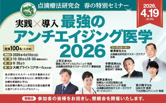 「最強のアンチエイジング医学 2026」は、各分野のエキスパートが示す最新のエビデンスと臨床知見をもとに、再現性の高い治療を実践的に学べるセミナーとなっており、自由診療の質向上と差別化を図る臨床導入型のアンチエイジングセミナーとなっています。 |