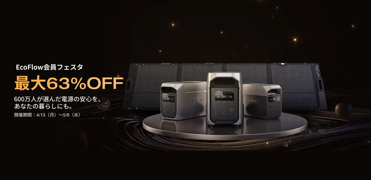 4月13日からの会員フェスタ期間中、エントリーモデルからフラッグシップモデルまで、最大63%OFFの特別価格でご提供いたします。新生活や防災対策の強化に、ぜひこの機会にEcoFlow会員へご登録ください。 |