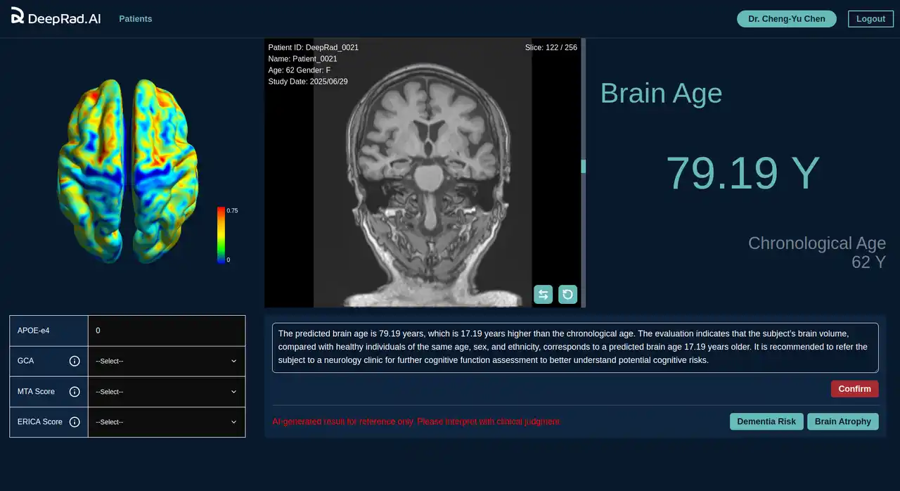 認知症対策において、脳の変化を客観的に評価することが重要です。「DeepBrain」は、MRI画像をもとに脳年齢を算出し、脳の萎縮度を定量的に評価します。さらに、人工知能を活用することで、将来的な認知機能低下のリスク予測も可能としています。 |