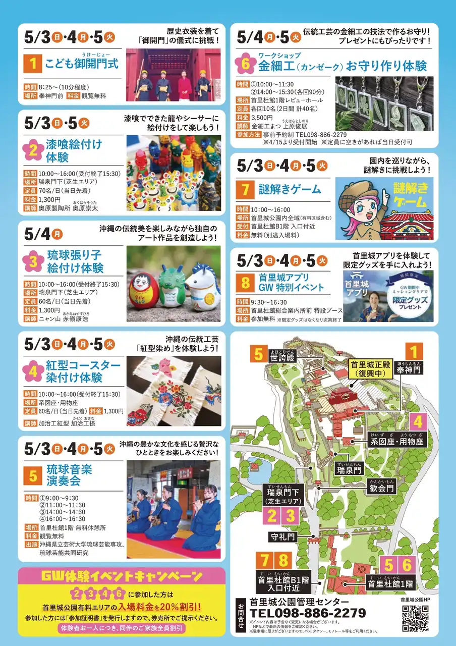 首里城公園では、令和8年5月3日(日)~5月5日(火)の3日間、「ゴールデンウィーク体験イベント2026」を開催します。琉球王国時代の伝統技法に触れる「金細工(カンゼーク)お守り作り体験」や「紅型コースター染付け体験」、昔ながらの伝統美を体験する「琉球張り子絵付け体験」。さらに、公園内を巡りながら謎解きに挑戦する「謎解きゲーム」など、親子で楽しめるイベントも多数ご用意しています。 |