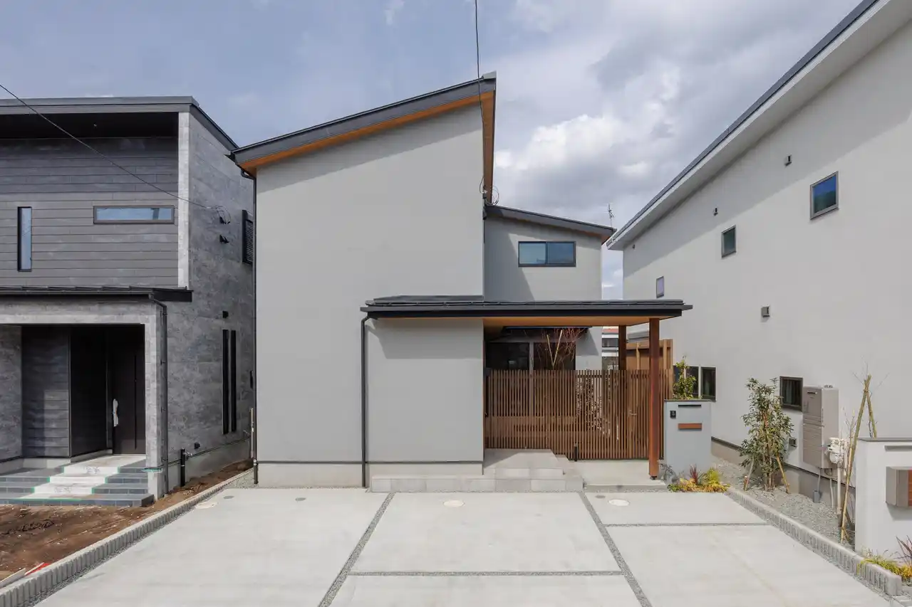道路側には大きな開口を設けず、生活感を外に出さない構成。 |
