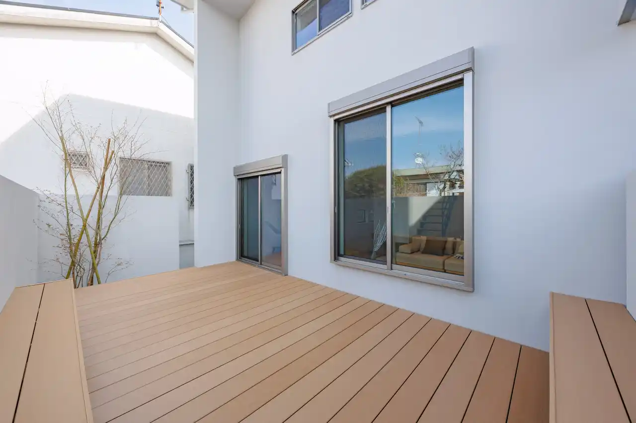2. リビングと一体化するウッドデッキ |