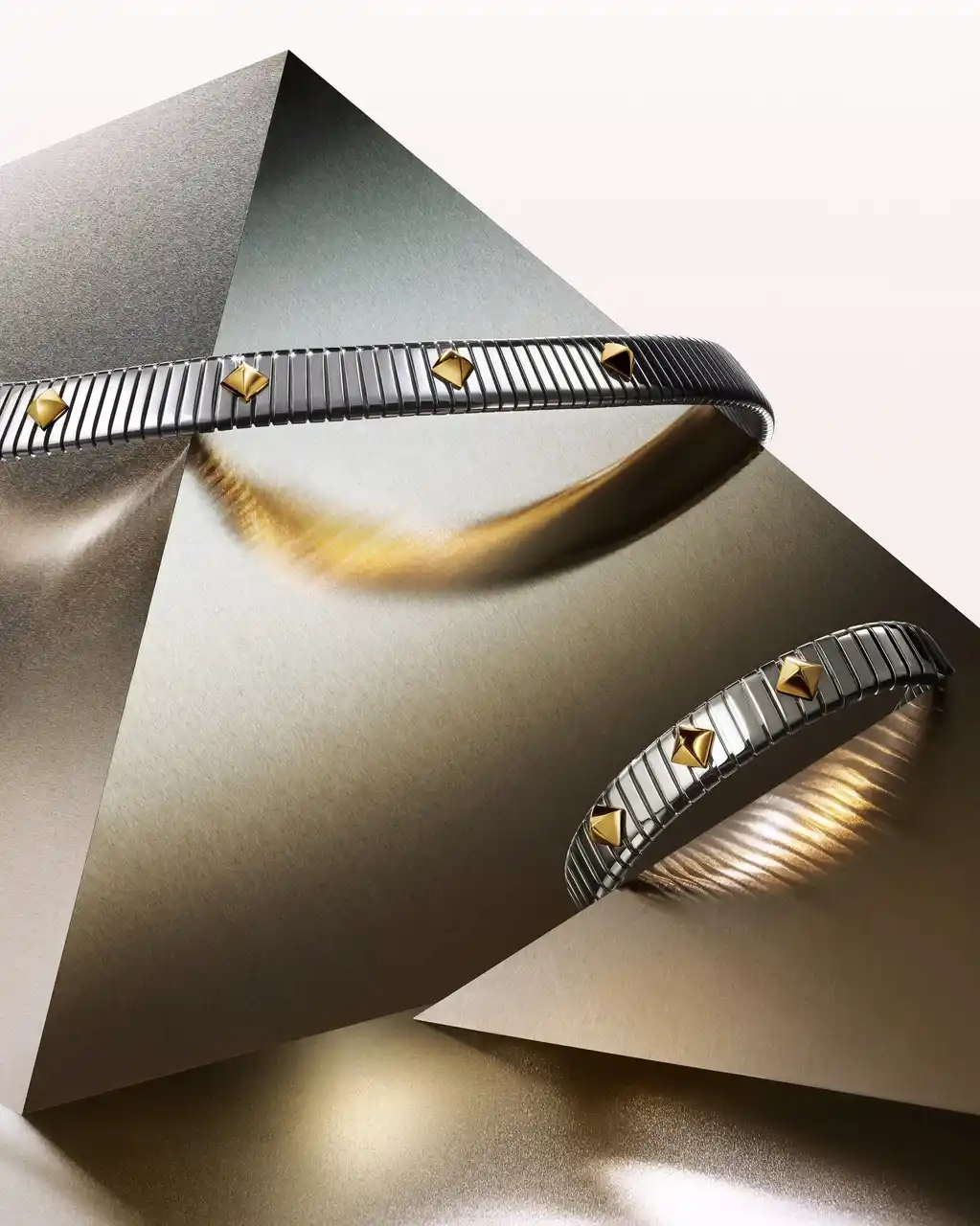 革新的なヴィジョンから生まれたブルガリ トゥボガス コレクションは、産業とジュエリーデザインを融合させたネックレスとブレスレットを発表します。1970年代のブルガリの大胆なデザインを彷彿とさせるこれらの作品は、ステンレススティール製の象徴的な柔軟で継ぎ目のないコイルを特徴としています。イエローゴールドのスタッズが表面にアクセントを加え、深みと洗練されたコントラストの遊びを添えています。ゴールドとスティールはシームレスに融合し、デザインの流れるような動きを高め、大胆な創造性と卓越した職人技が具現化されています。 |