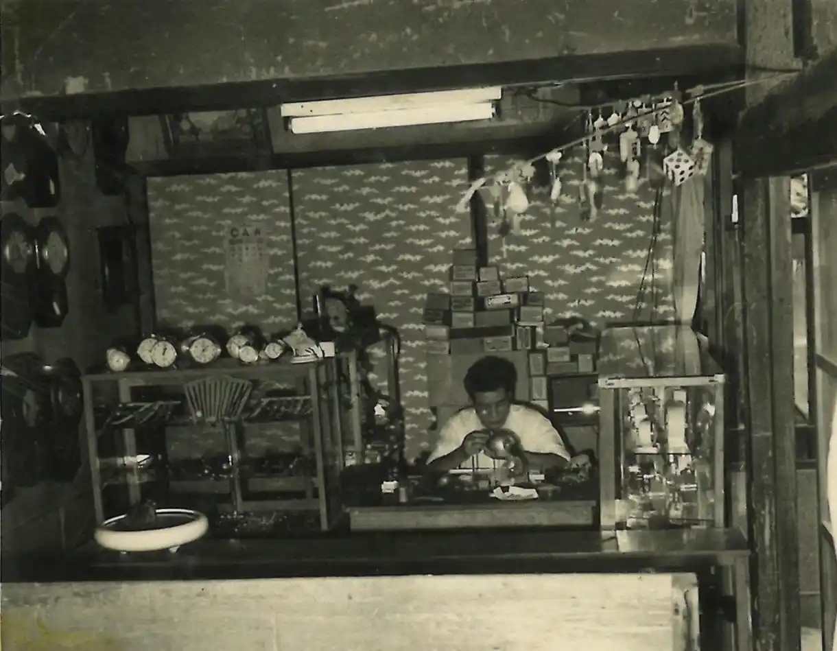 創業当時の店内で、時計と向き合いながら技を磨く若き日の故人の姿。 |