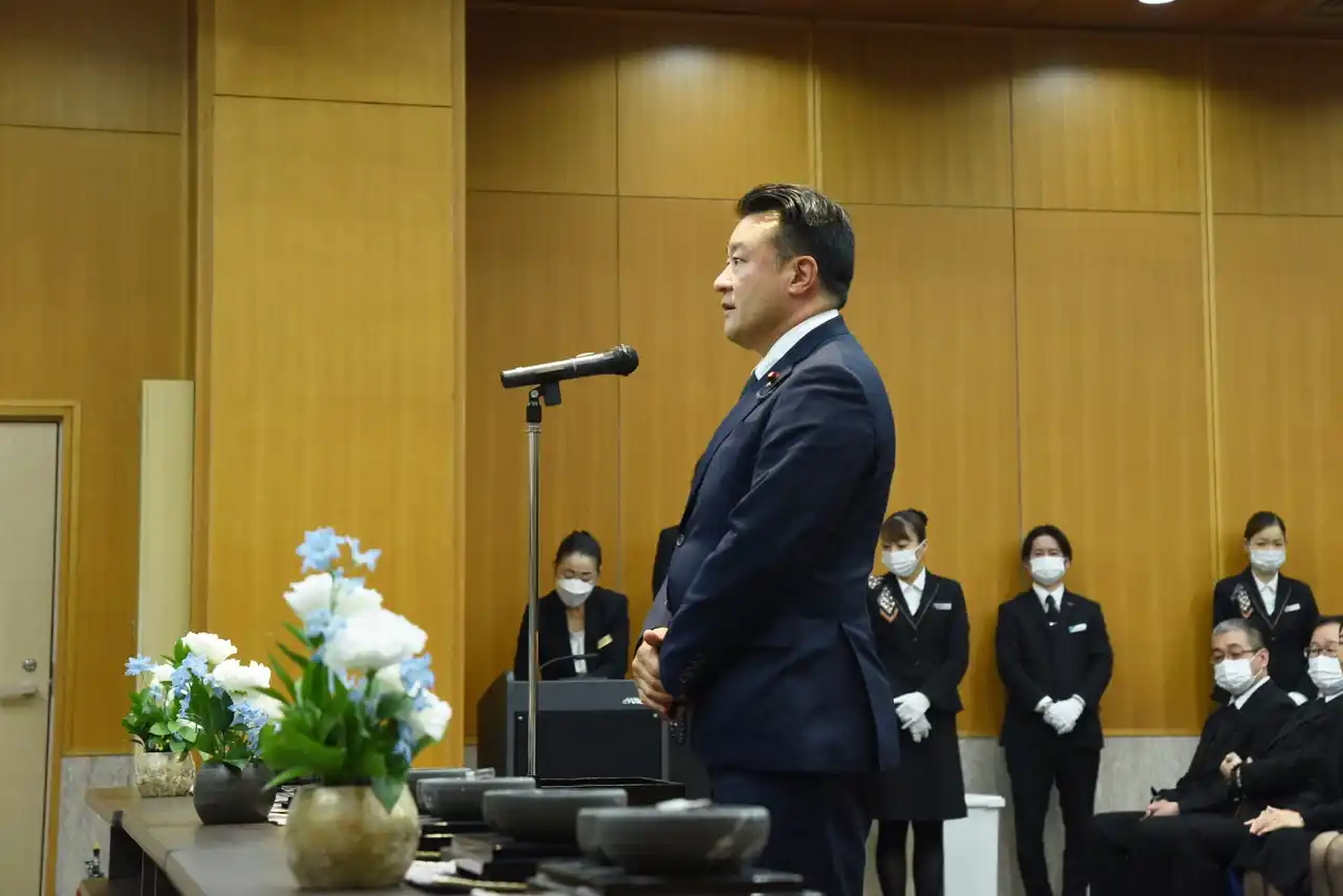 式中では、衆議院議員 大岡敏孝様をはじめ、故人とゆかりの深い関係者の皆様より弔辞を賜りました。また、社員を代表し、弊社 常務取締役 小松貴浩より弔辞が述べられました。 |