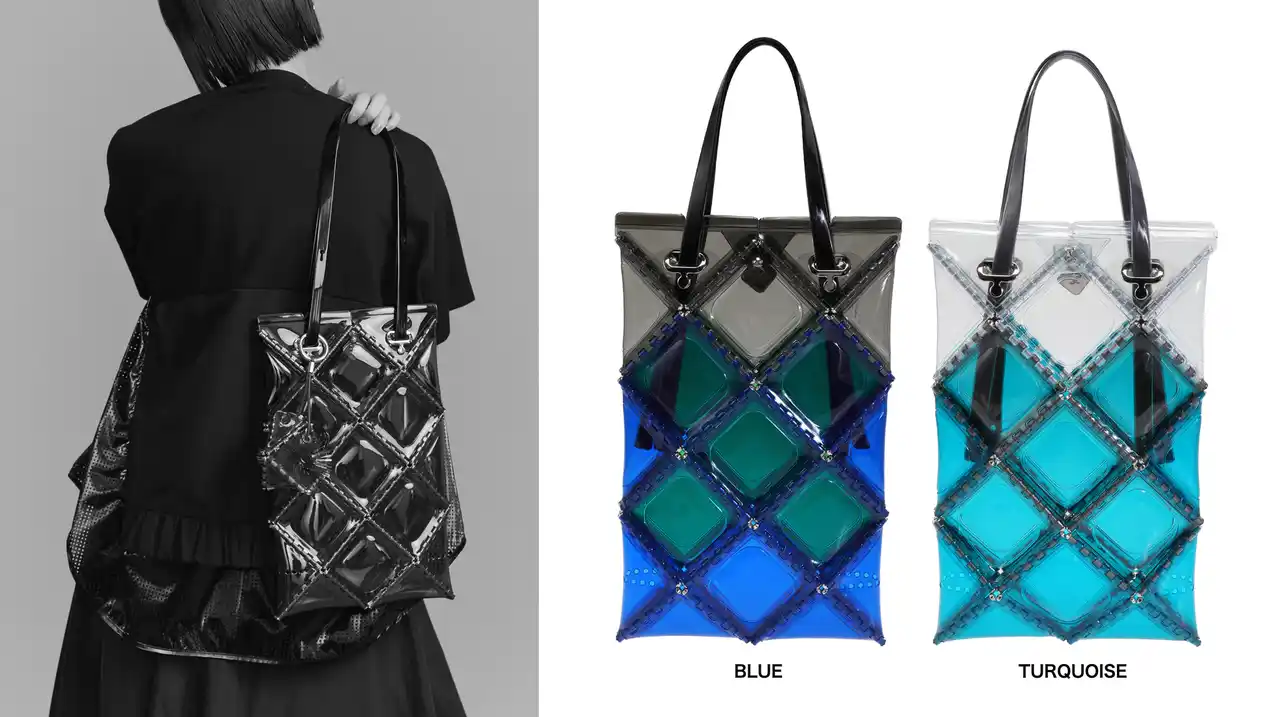 縦長のシルエットが特徴の「FLAT TOTE」シリーズをベースに、UN3D.の洋服との相性を意識して再構築されたモデル。光を映すPVC素材と構造的なディテールが、ミニマルでありながら強い存在感を放ちます。 |