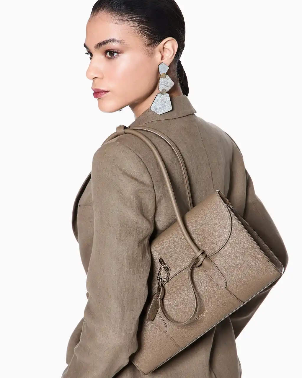 新たに加わったショルダーバッグは、しなやかなペブルドカーフスキンを用い、優れた収納力と実用性を備えたデザインに仕上げました。横長のフォルムが生み出す端正なバランスに、ダブルチューブハンドルとスナップボタン付きストラップを組み合わせることで、機能性と美しさを自然に融合。開閉にはメタルのスナップフックとリングをあしらい、ミニマルな佇まいの中にさりげない個性を添えています。 |