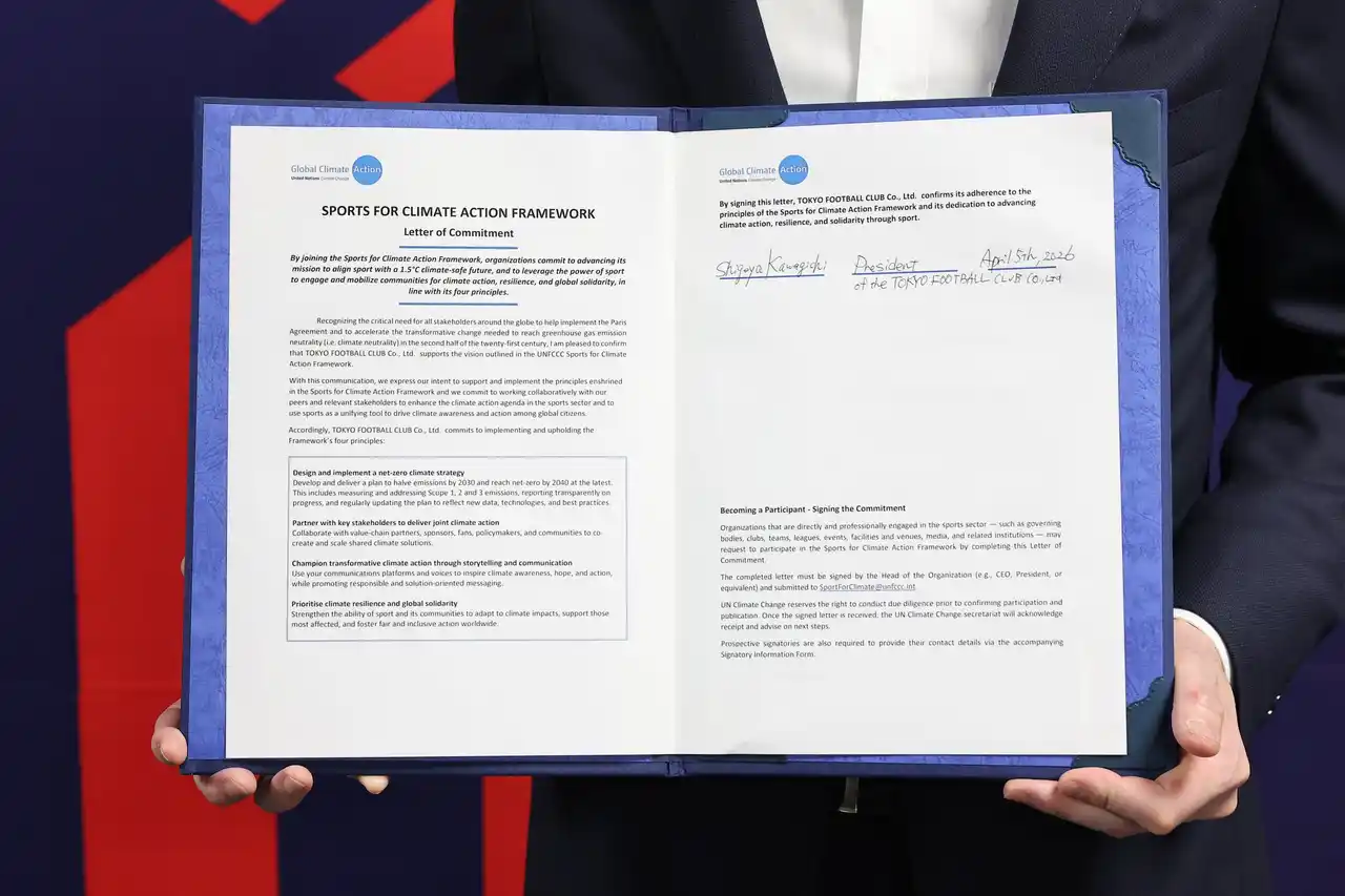 東京フットボールクラブ株式会社 代表取締役社長 川岸滋也 「今回の署名は、私たちのソーシャルステートメントとサステナビリティ戦略を、国際的な気候行動の枠組みへ接続する大きな一歩です。ファン・サポーター、パートナー、自治体、地域のみなさまとともに、東京から具体的なアクションを積み重ね、スポーツの力でよりよい未来をつくってまいります」 |
