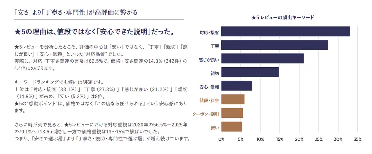 | クチコミを分析した結果、割引の多さや立地の良さ以上に、受付時のコミュニケーションやプロとしての丁寧な説明が、店舗の評価を大きく左右していることが分かります。 | |||||||