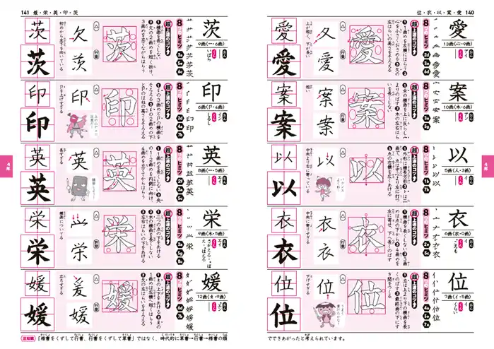 例えば「愛」の字では「8つのヒミツ」のうち「1.中心をとらえる」と「6.左は短く右は長く」というポイントが示され、文字がどのように構成されているかを具体的なガイドとともに解説。一画ごとの筆の運びから全体のバランスまで、感覚的ではなく論理的に「美しさ」が定義されています。 |