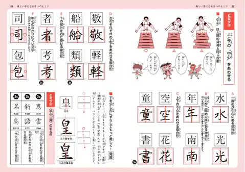 漢字向けに「美しい字になる8つのヒミツ」をはじめ、「ひらがなを美しく書く5つのヒミツ」「カタカナを美しく書く4つのヒミツ」「行書を美しく書く5つのヒミツ」で解説しています。 |