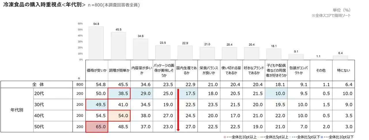 ■冷凍食品を購入する際に重視するポイント、50代では「価格の安さ」や「国内生産であるか」が高い傾向 |