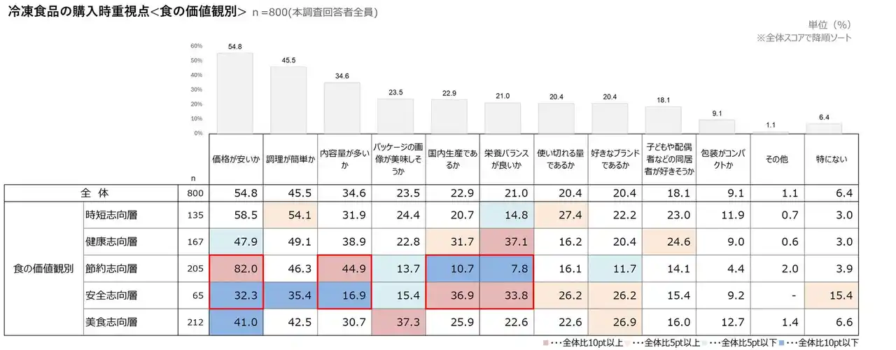 冷凍食品の購入時重視点<食の価値観別>(n=800) |