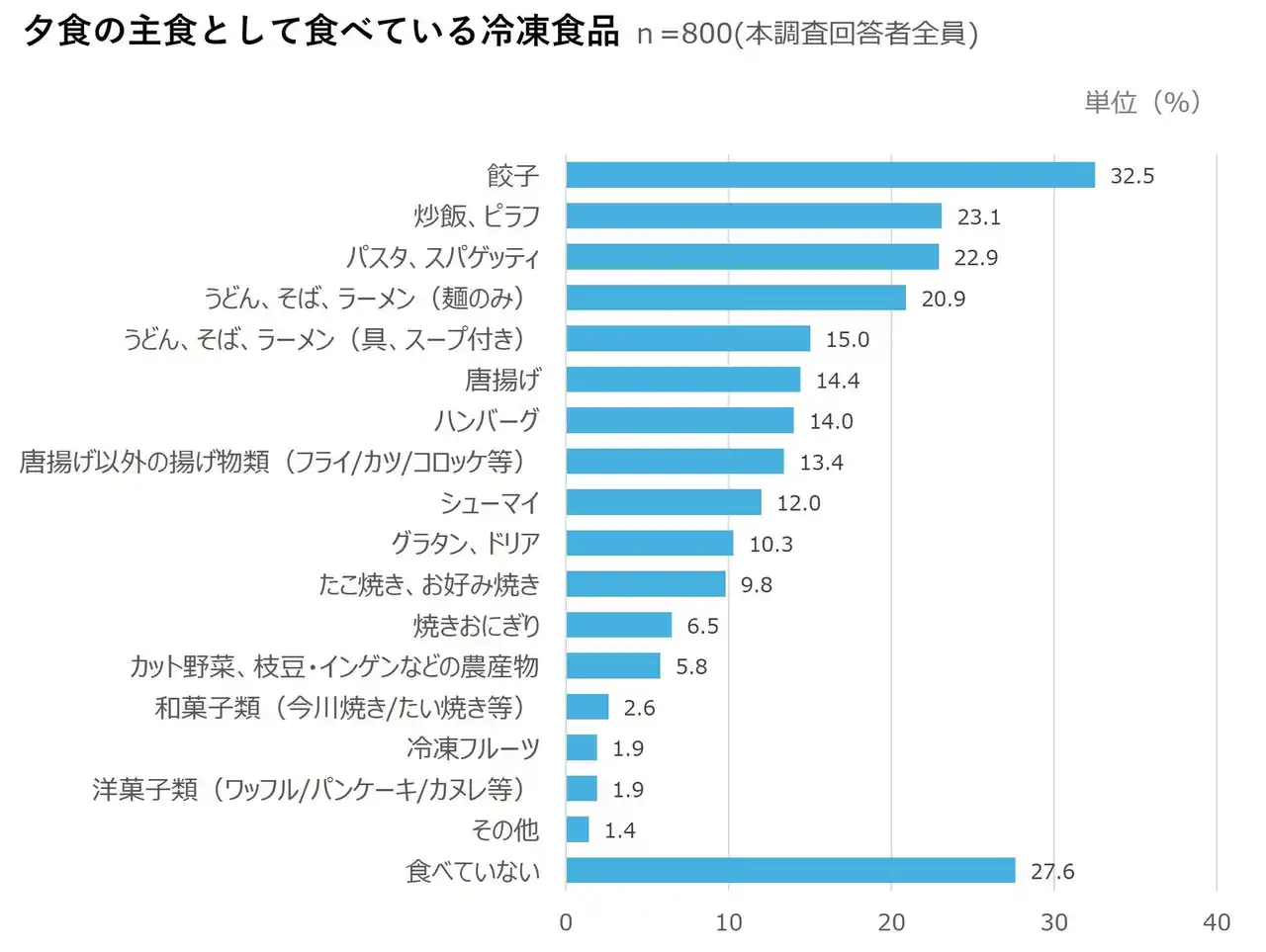 夕食の主食として食べている冷凍食品(n=800)をみると、「餃子(32.5%)」が最も多く、次いで「炒飯、ピラフ(23.1%)」、「パスタ、スパゲッティ(22.9%)」と続いた。全体での購入率が上位に挙がっていた定番の冷凍食品が、夕食の主食として広く活用されていることがわかる。 |