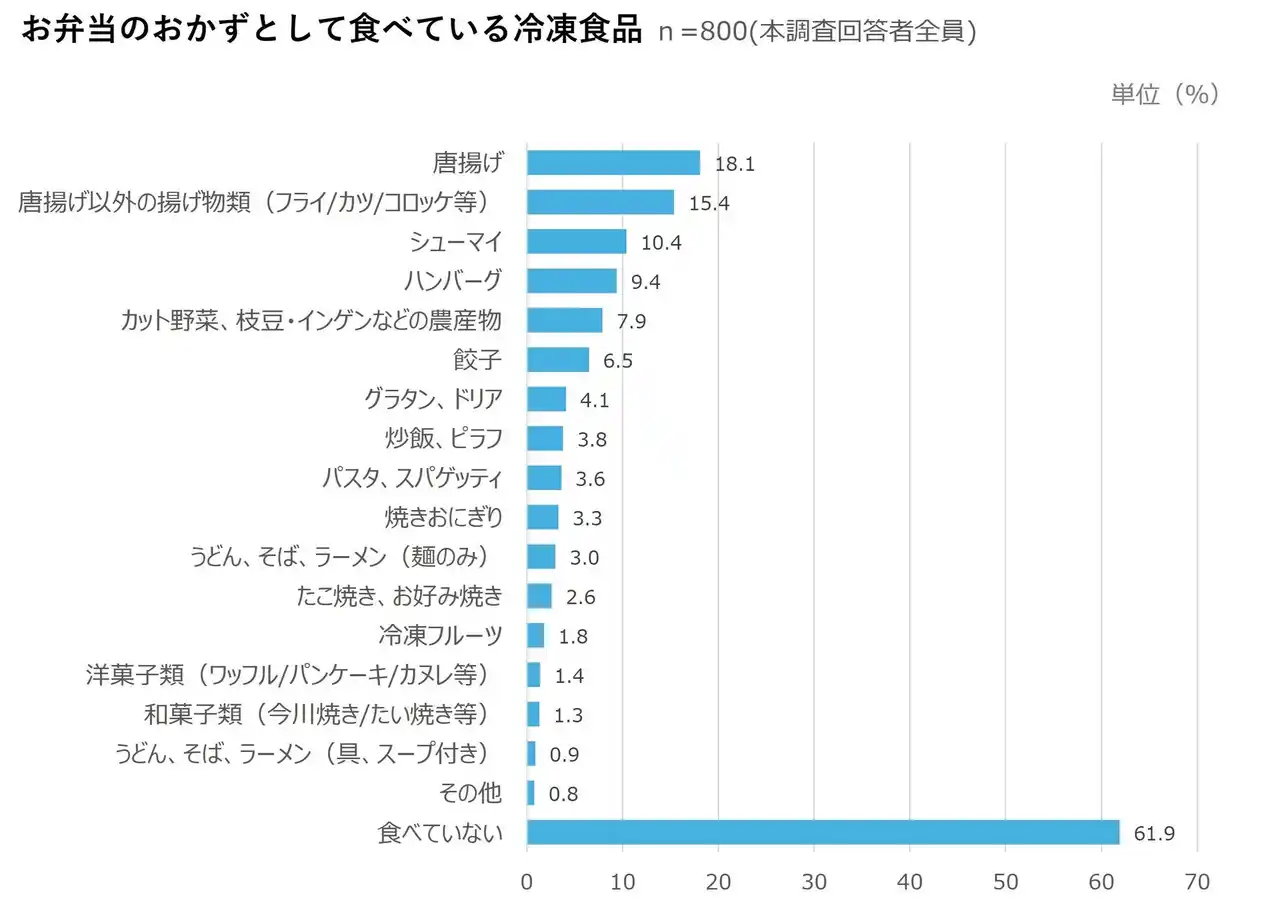 お弁当のおかずとして食べている冷凍食品(n=800)をみると、「唐揚げ(18.1%)」が最も多く、次いで「唐揚げ以外の揚げ物類(フライ/カツ/コロッケ等)(15.4%)」、「シューマイ(10.4%)」と続いた。「お弁当のおかず」も「おかずの1品」と同様に、唐揚げやフライといった揚げ物系の冷凍食品が好まれていることがわかる。 |