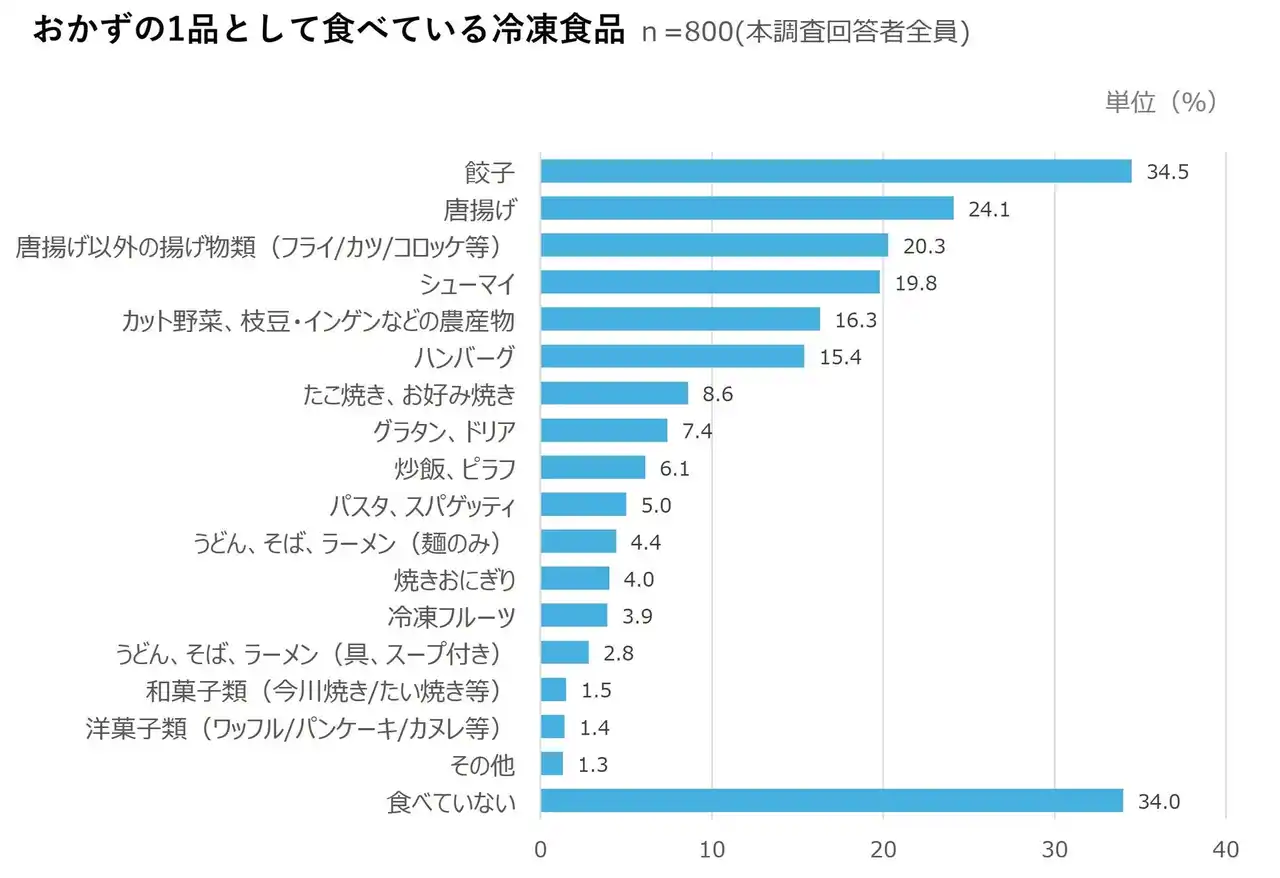 おかずの1品として食べている冷凍食品(n=800)をみると、「餃子(34.5%)」が最も多く、次いで「唐揚げ(24.1%)」、「唐揚げ以外の揚げ物類(フライ/カツ/コロッケ等)(20.3%)」と続いた。おかずの1品としては、餃子に加えて、唐揚げやフライといった揚げ物系の冷凍食品が好まれていることがわかる。 |