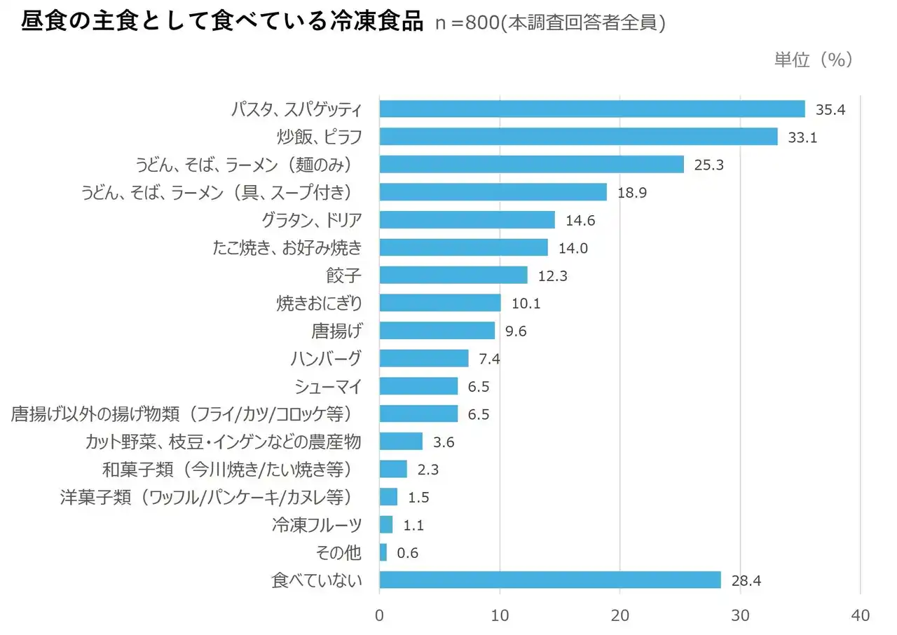 昼食の主食として食べている冷凍食品(n=800)をみると、「パスタ、スパゲッティ(35.4%)」が最も多く、次いで「炒飯、ピラフ(33.1%)」、「うどん、そば、ラーメン(麺のみ)(25.3%)」と続いた。さらに、「うどん、そば、ラーメン(具、スープ付き)(18.9%)」が4位に挙がっていることからも、昼食の主食としては麺系の冷凍食品が好まれていることがわかる。 |