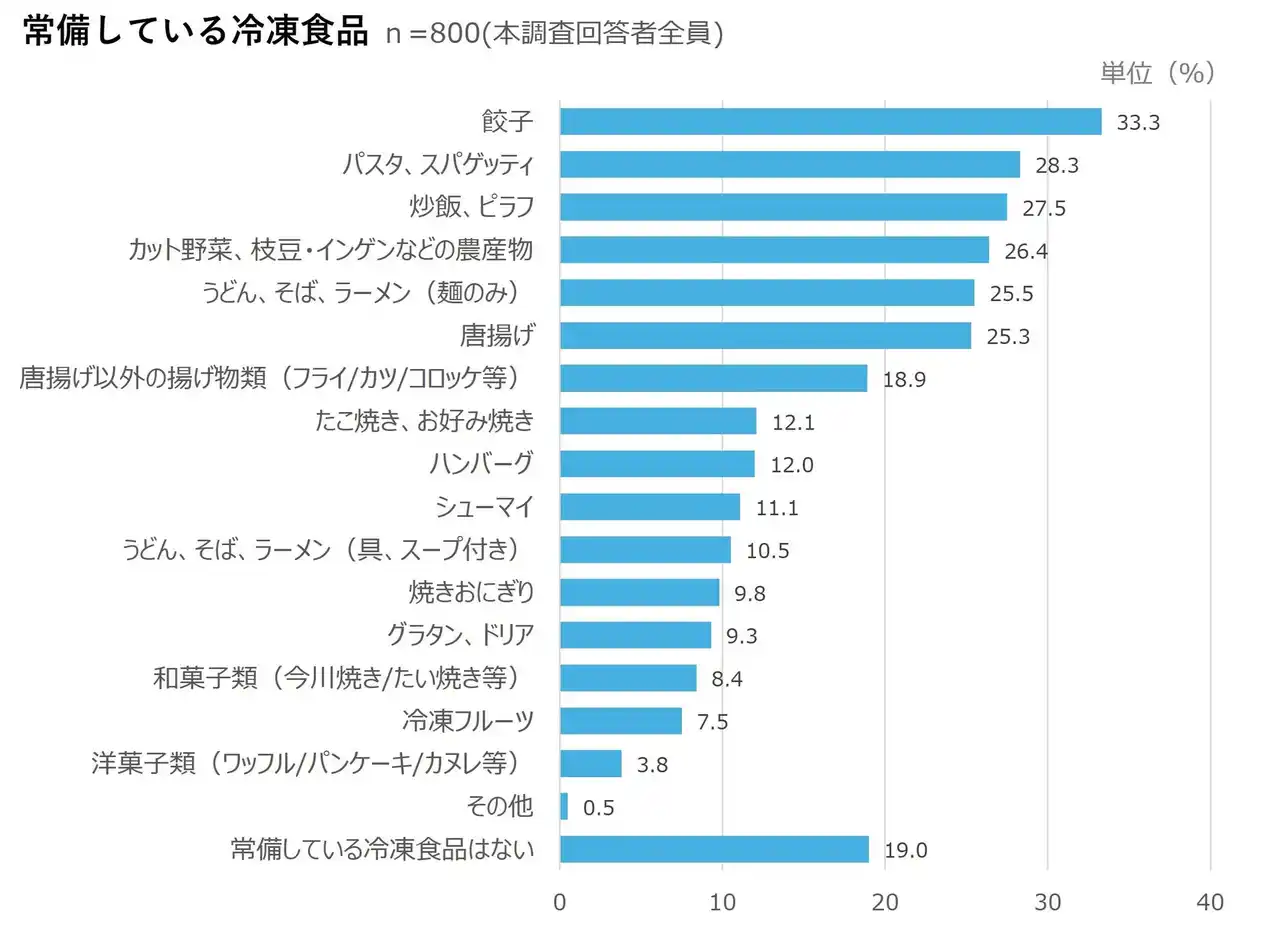 冷凍庫に常備している冷凍食品(n=800)を尋ねたところ、直近3カ月以内に冷凍食品を購入したことがある人のうち、常備している冷凍食品がある人は8割を超えた。具体的な常備率については、「餃子(33.3%)」が最も多く、次いで「パスタ、スパゲッティ(28.3%)」、「炒飯、ピラフ(27.5%)」と続いた。 |