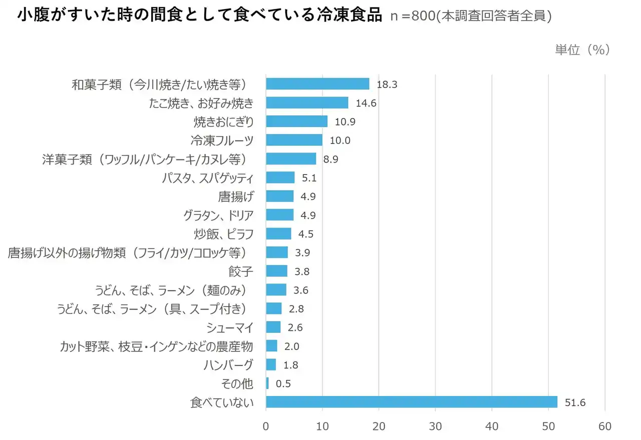 小腹がすいた時の間食として食べている冷凍食品(n=800)をみると、「和菓子類(今川焼き/たい焼き等)(18.3%)」が最も多く、次いで「たこ焼き、お好み焼き(14.6%)」、「焼きおにぎり(10.9%)」と続いた。さらに、「洋菓子類(ワッフル/パンケーキ/カヌレ等)(8.9%)」が5位に浮上しており、他の利用シーンでは下位であったお菓子系の冷凍食品が、間食としては上位に選ばれていることがわかる。 |