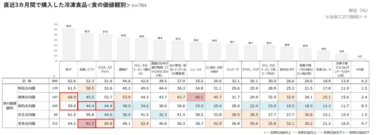 直近3カ月で購入した冷凍食品<食の価値観別>(n=800) |