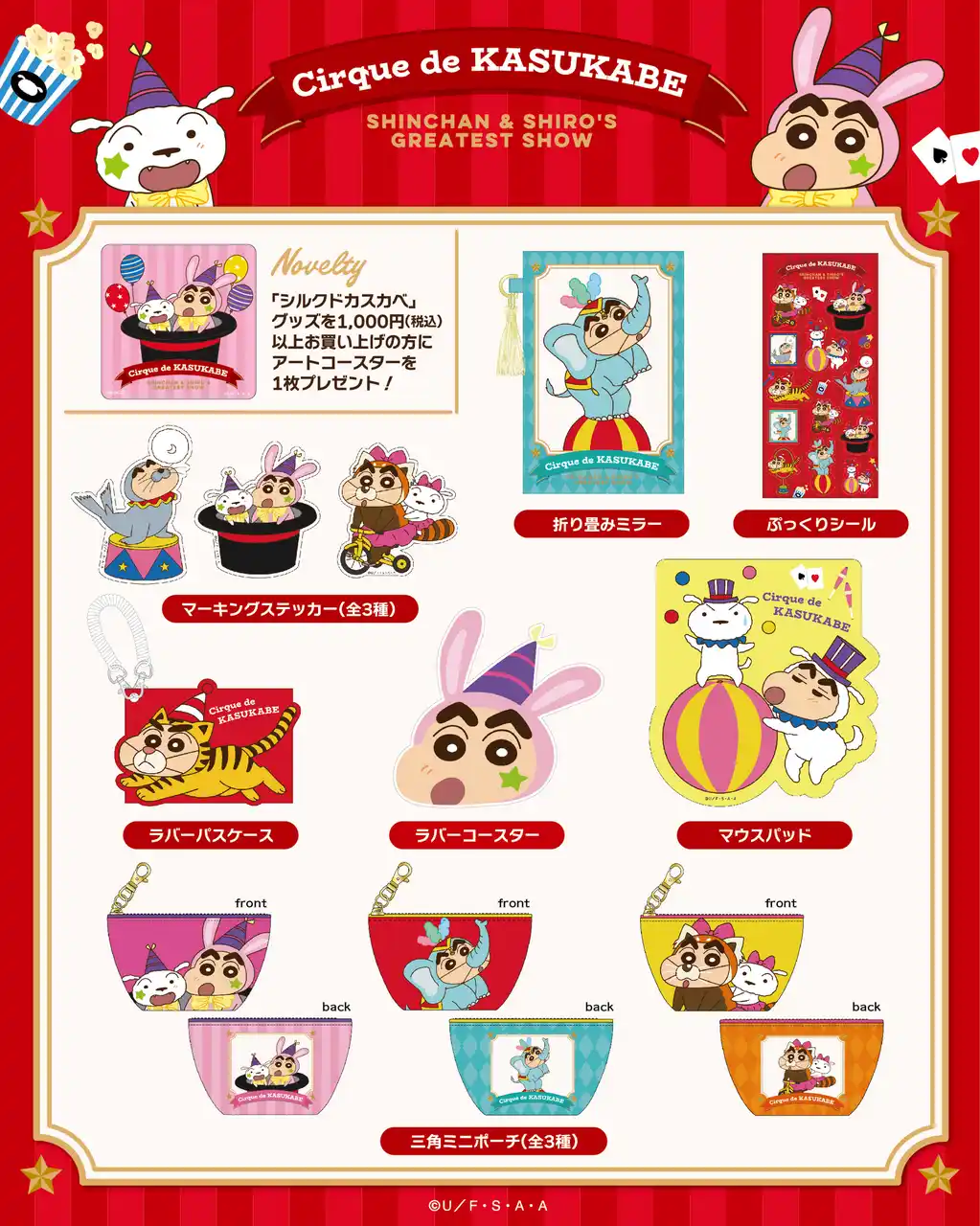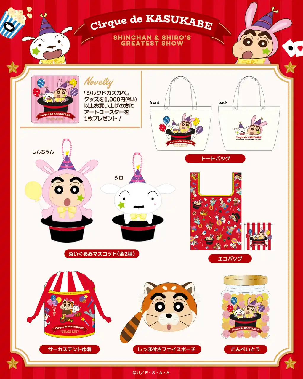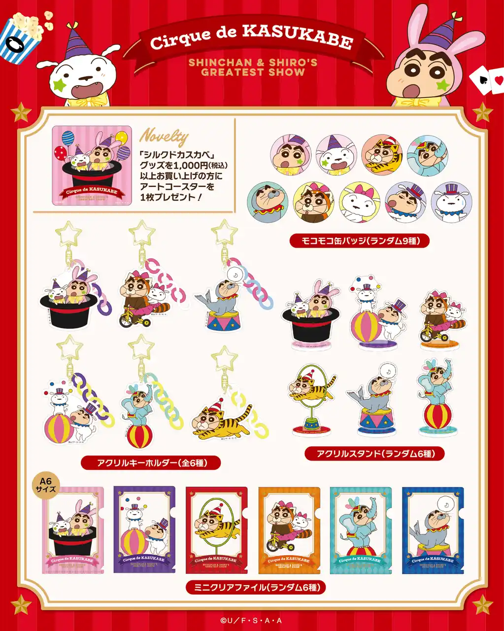双葉社は、「クレヨンしんちゃん」の描き下ろし新シリーズ『シルクドカスカベ』グッズを、2026年4月17日(金)より発売いたします。しんちゃんとシロたちのとびきりキュートなサーカスが開演♪ 華やかでポップな衣装に身を包んだしんちゃんとシロが、思わず写真を撮りたくなるような愛らしいデザインで登場します。アクリルキーホルダーやポーチ、トートバッグなど、毎日をちょっと楽しく彩るアイテムをラインナップ。普段使いはもちろん、ちょっとしたお出かけにもぴったりです。さらに、税込1,000円以上ご購入の方には、特典としてアートコースターをプレゼント。この春は『シルクドカスカベ』の世界観をぜひお楽しみください。 |