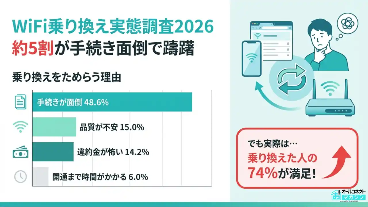 ・「手続きが面倒」48.6%が乗り換えの最大障壁 ・「違約金が怖い」は14.2%にとどまり、金銭面より手間がハードル ・工事不要・即日利用できるサービスなら、この障壁を大幅に低減できる |