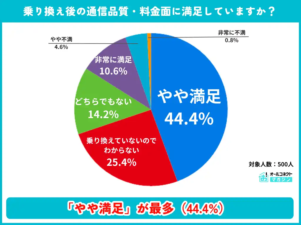 「乗り換えていないのでわからない」(25.4%)を除いた乗り換え経験者に限ると、満足計は約74%に達します。不満(計5.4%)は少数にとどまっています。 |