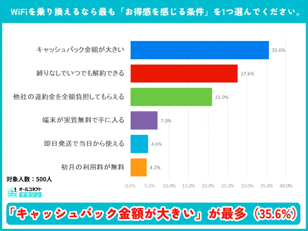 また、WiFiを乗り換えるなら最も「お得感を感じる条件」を聞いたところ、「キャッシュバック金額が大きい」が35.6%で1位でした。 |