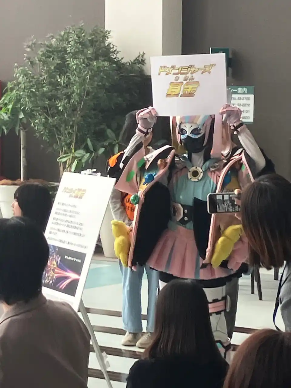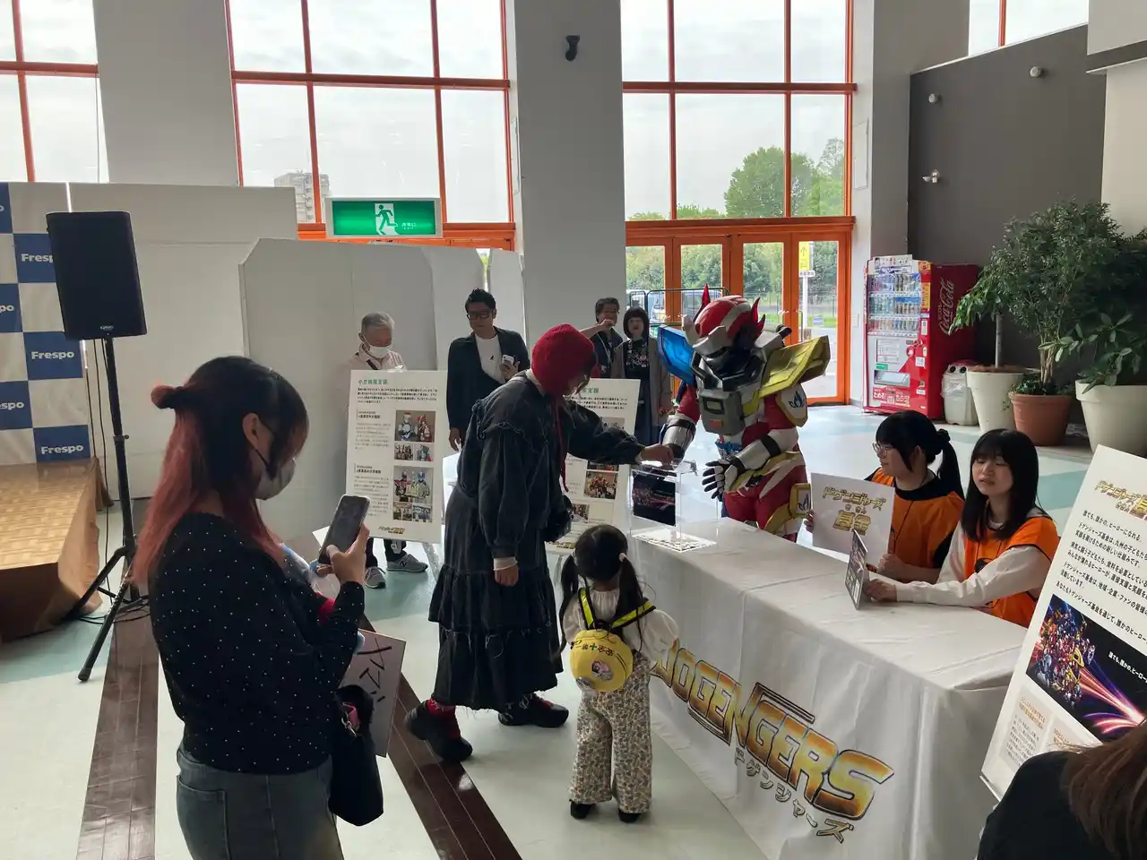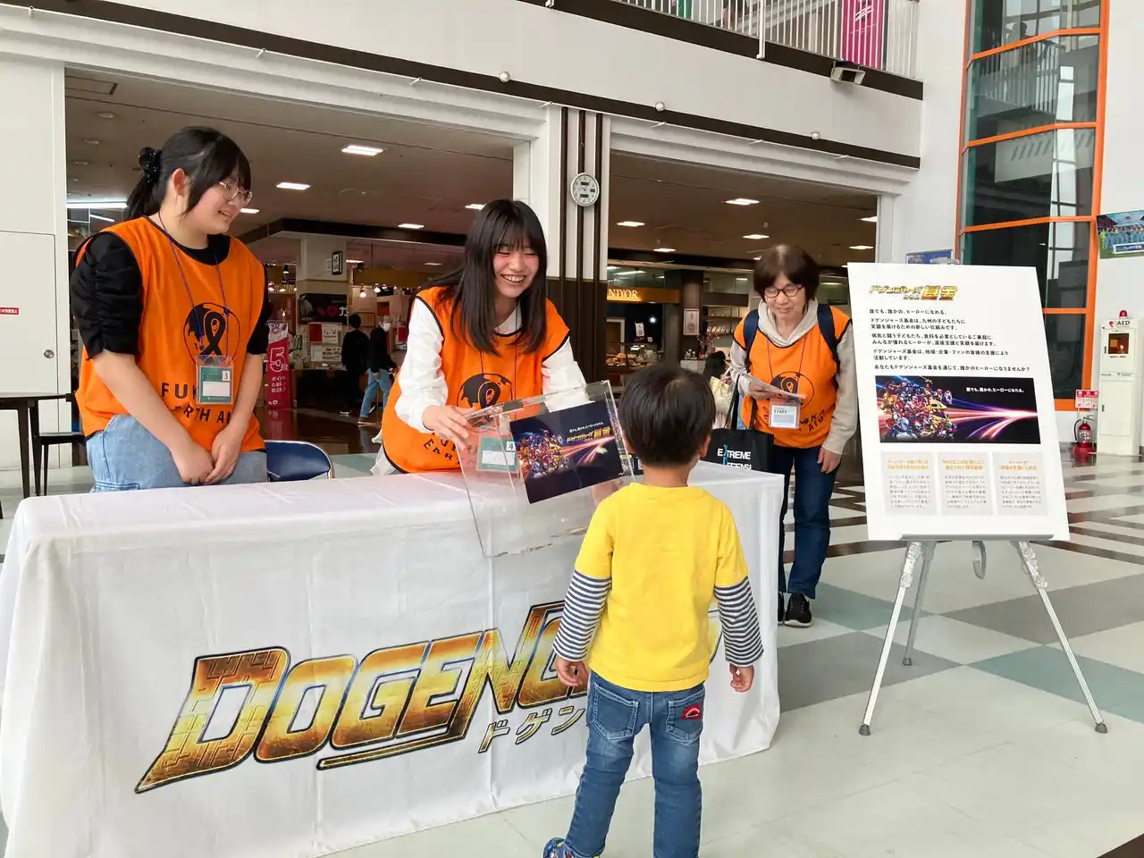 当日は、本基金を活用し、1階ウエルカムコートにて「ドゲンジャーズと遊ぼう」を開催しました。 ジェスチャークイズやお絵描き伝言ゲーム、じゃんけん大会、「みんなで踊ろう♪ドゲン日和」などの企画により、会場は大いに盛り上がり、ヒーローとのふれあいを通じて多くの子どもたちが笑顔を見せました。あわせて、会場内で実施したドゲンジャーズ基金への募金活動においても、多くの皆さまから温かいご支援を賜りました。 |