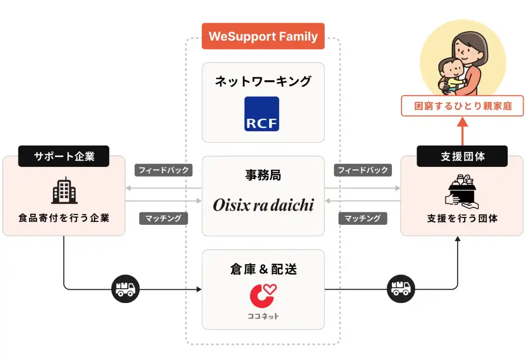 「WeSupport Family」とは、オイシックス・ラ・大地が運営しており、困窮するひとり親家庭を支援するプラットフォームです。サポート企業から提供いただいた食材や物資を、ニーズとマッチングした上で、支援団体を介して毎月ご家庭にお届けしています。サポート企業には下記のようなメリットがあり、83社(2025年6月末時点)が賛同しています。 |