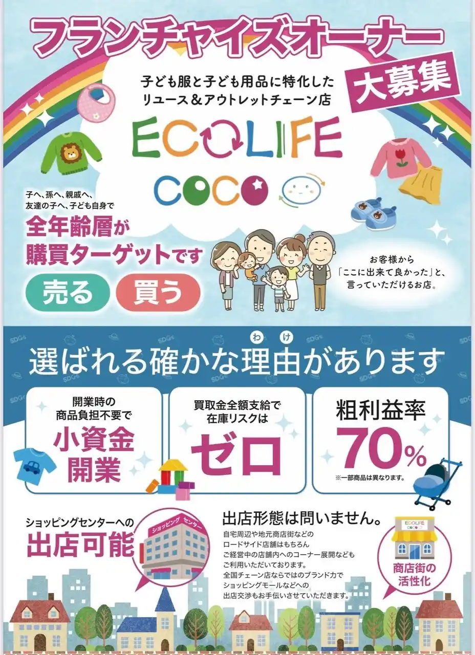 ECOLIFE COCO(エコライフココ)ではフランチャイズオーナーを募集中です。現在、子供用品専門のリユースショップで積極的に全国出店を進めている企業があまりなく競争相手が圧倒的に少ない業態です。在庫リスクが少ない簡潔明瞭なシステムで、高粗利益かつ安定した経営をサポートいたします。ご興味をお持ちの方は是非一度お問い合わせください。ECOLIFE COCOと共に全てのママが自然と笑顔になれるお店にチャレンジしませんか? https://ecolife-coco.com/fc/
