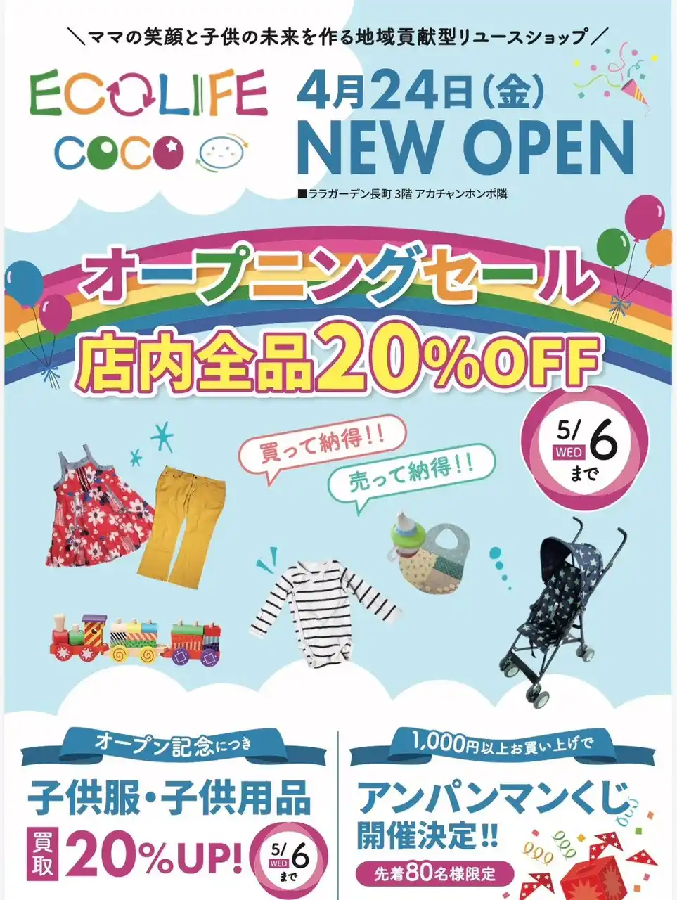 株式会社AVANCE(本社:東京都豊島区、代表取締役:葛西佳織)が展開する子供服リユースショップ ECOLIFE COCO(エコライフココ)は、新店舗「ララガーデン長町店」(宮城県仙台市)を 2026年4月24日(金)にオープンいたします。本店舗は、株式会社テレビユー福島の完全子会社である合同会社YouthBase が運営を担い、YouthBaseが運営するECOLIFE COCOとして2店舗目となります。地域のお客様に、サステナブルで楽しい子供服リユース体験を提供してまいります。 |