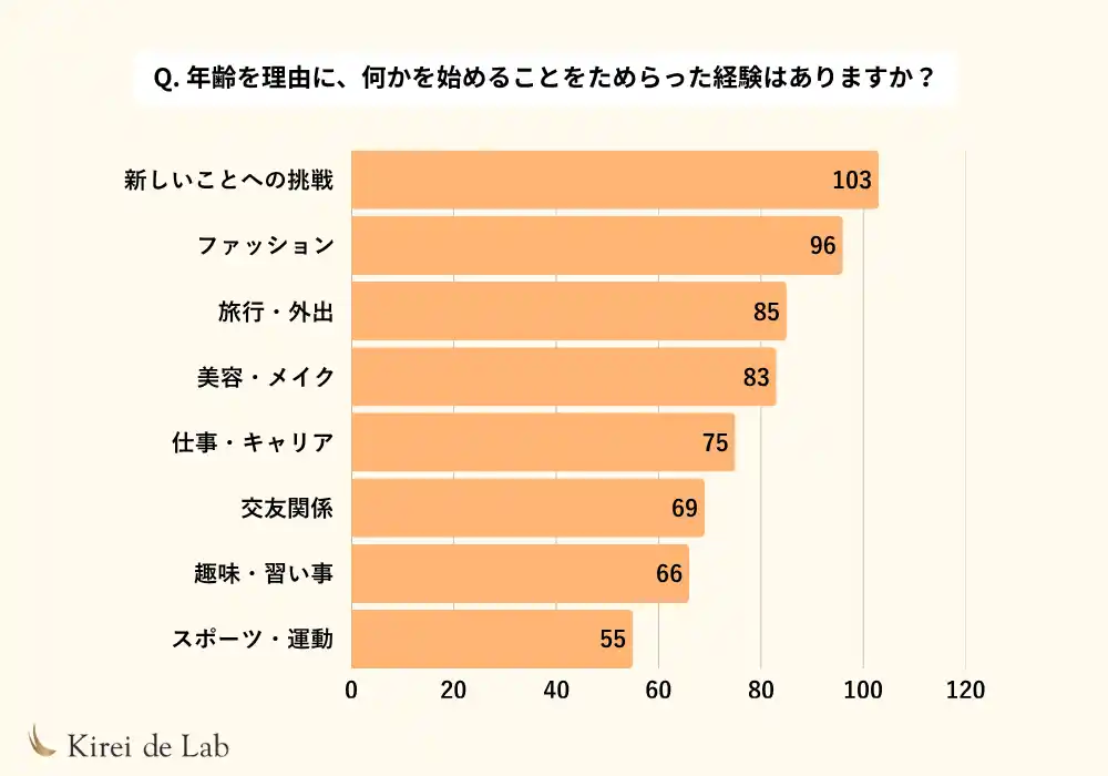 さらに、年齢を理由に何かを始めたり楽しんだりすることをためらった経験については、「特にない」が36.7%にとどまり、反対に言えば6割以上が何らかの場面で年齢を意識した経験があることがわかりました。ためらったこととしては、「新しいことへの挑戦」、「ファッション」、「旅行・外出」、「美容・メイク」、「仕事・キャリア」などが挙がっています。 |