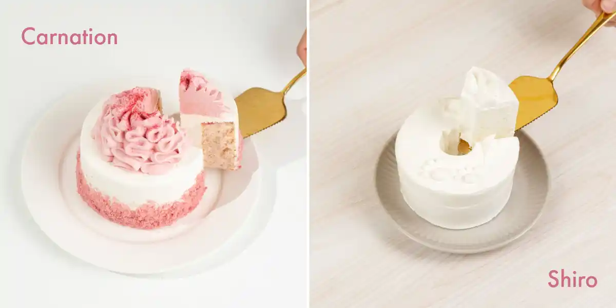 | 一方、『Carnation』は、カーネーションをモチーフにした華やかなシフォンケーキ。いちごのふわふわとした生地に、甘酸っぱいソースをしみ込ませ、中心にはコクのあるレアチーズクリームをたっぷりと詰めました。ミルキーなコクと爽やかな酸味が調和した、軽やかな口どけが特長です。 | |||