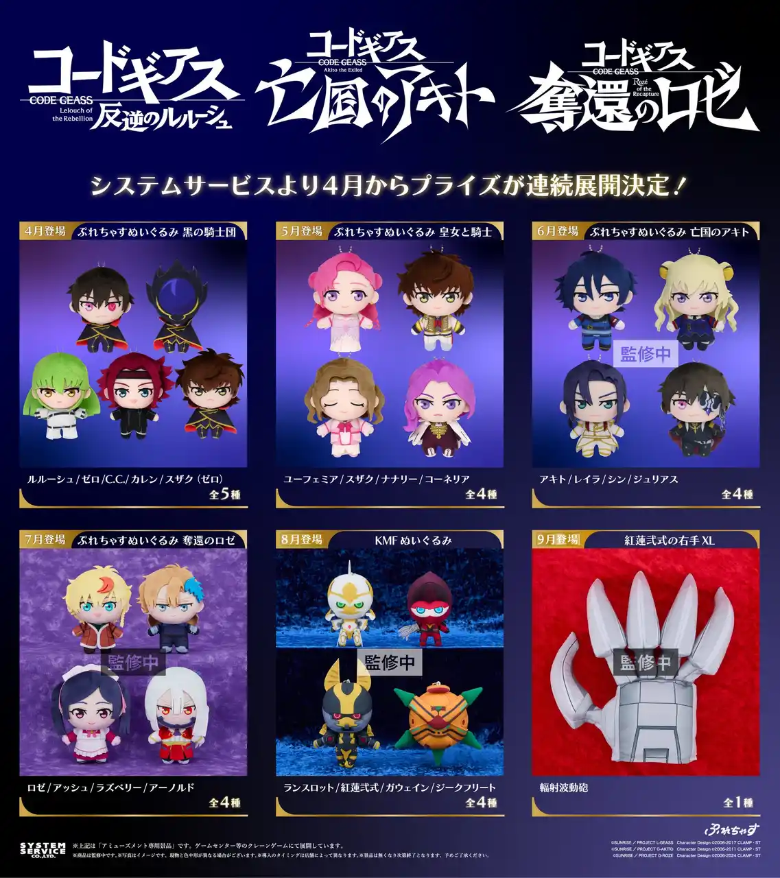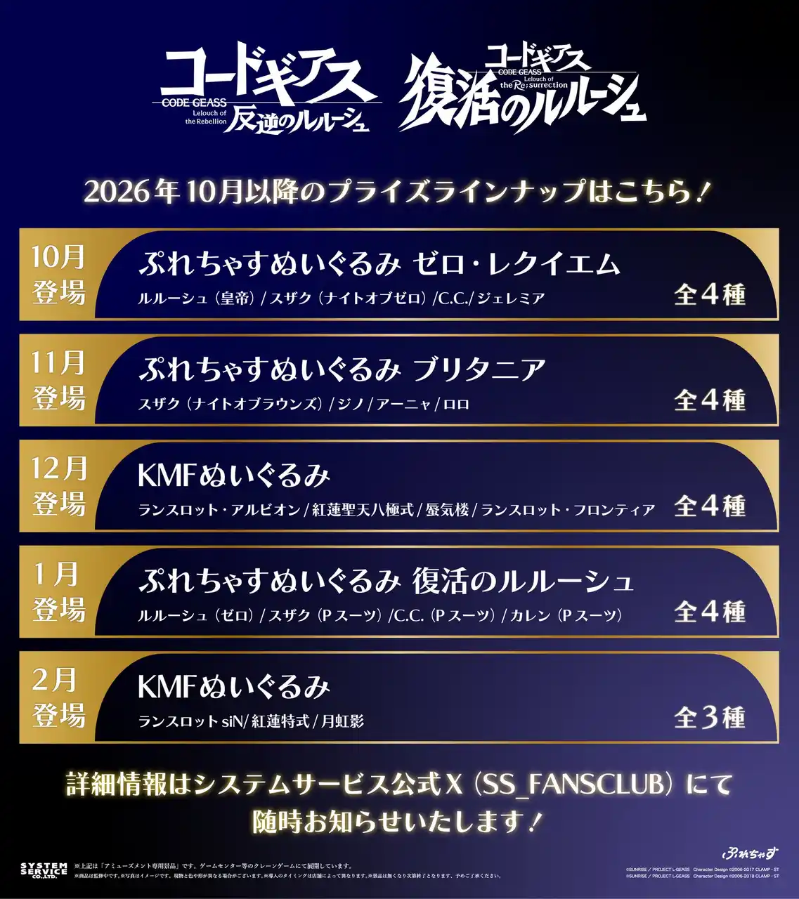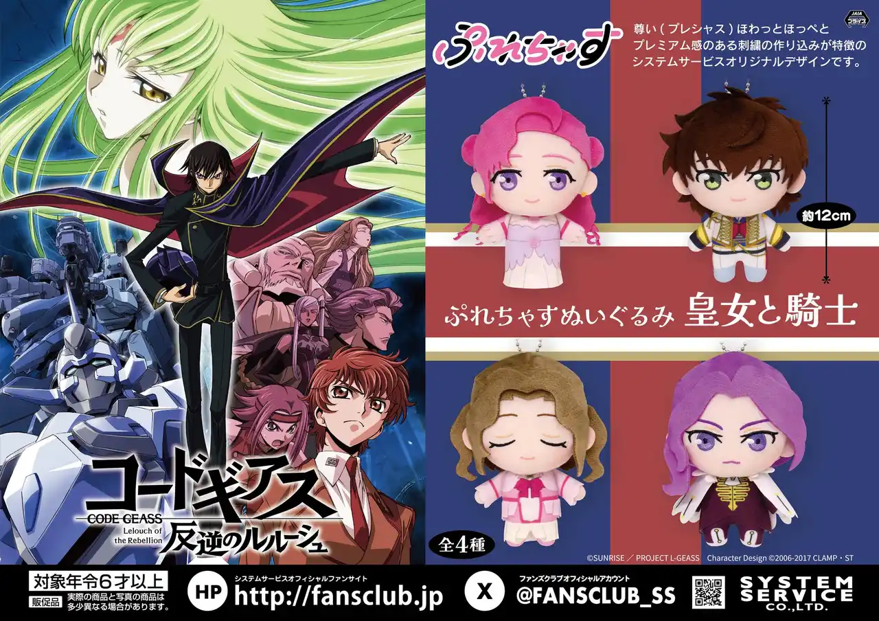 システムサービス株式会社(本社:東京都豊島区、代表取締役社長:田村宗弘)は、「コードギアス」シリーズのプライズ商品を2026年4月より順次アミューズメント施設にて展開いたします。 |