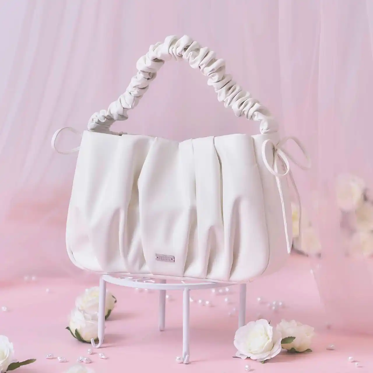 ラグジュアリーなブランドの世界観を崩さずに、オーナー様が日常で使いやすいシンプルなデザインを追求しました。柔らかくもっちりとした質感の素材を使用し、ギャザーやタックの量を微調整することで、特別感のある佇まいに仕上げております。一見するとファッションバッグのような見た目ですが、内側にはボトルホルダーやポケットを備えており、十分な収納スペースを確保しました。付属のテープを使用することでカートのハンドルに固定することが可能になります。 |