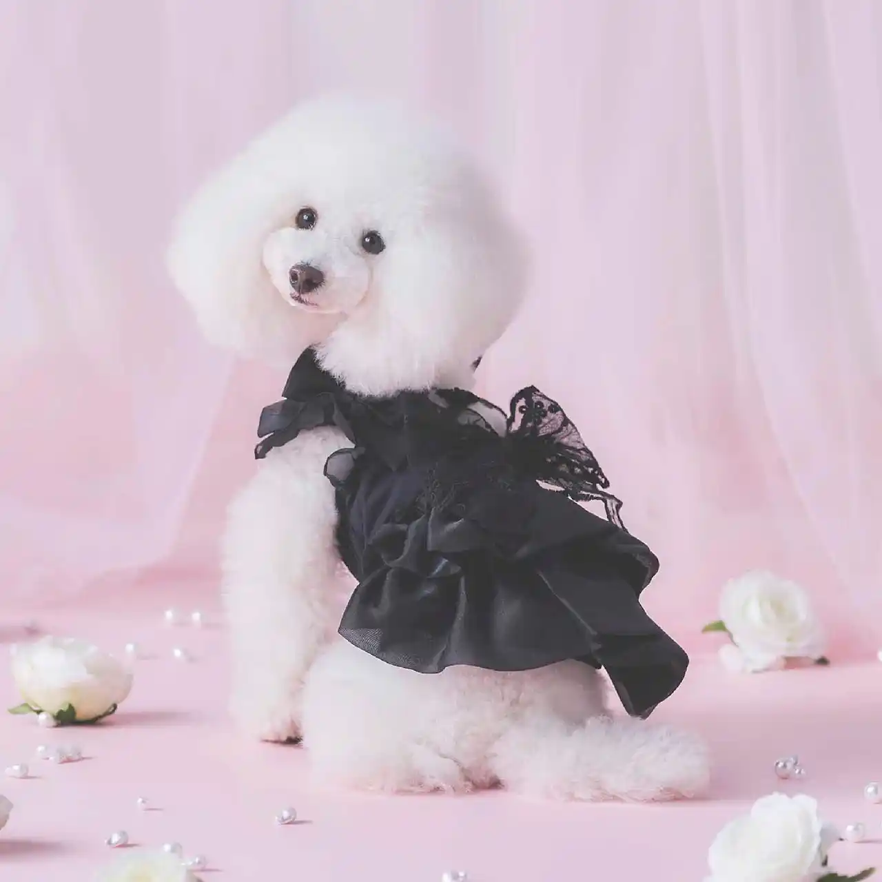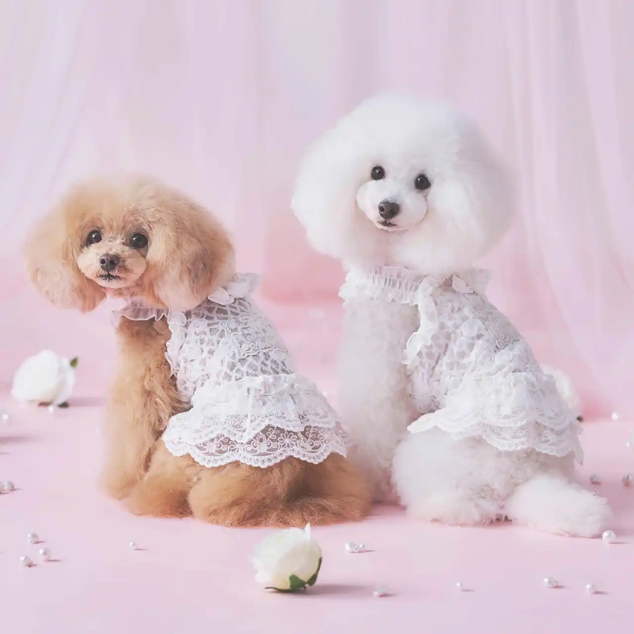 背中のギャザークロスデザインやスカラップレースのリボンをポイントにしたデザインです。スカート部分に、軽やかさと適度なハリを兼ね備えたオーガンジー素材を使用することにより、ボリューム感があるシルエットを実現しました。また、愛犬の肌に触れる部分には接触冷感機能のある生地を採用しているため、夏場でも涼しく快適に着用できます。 |
