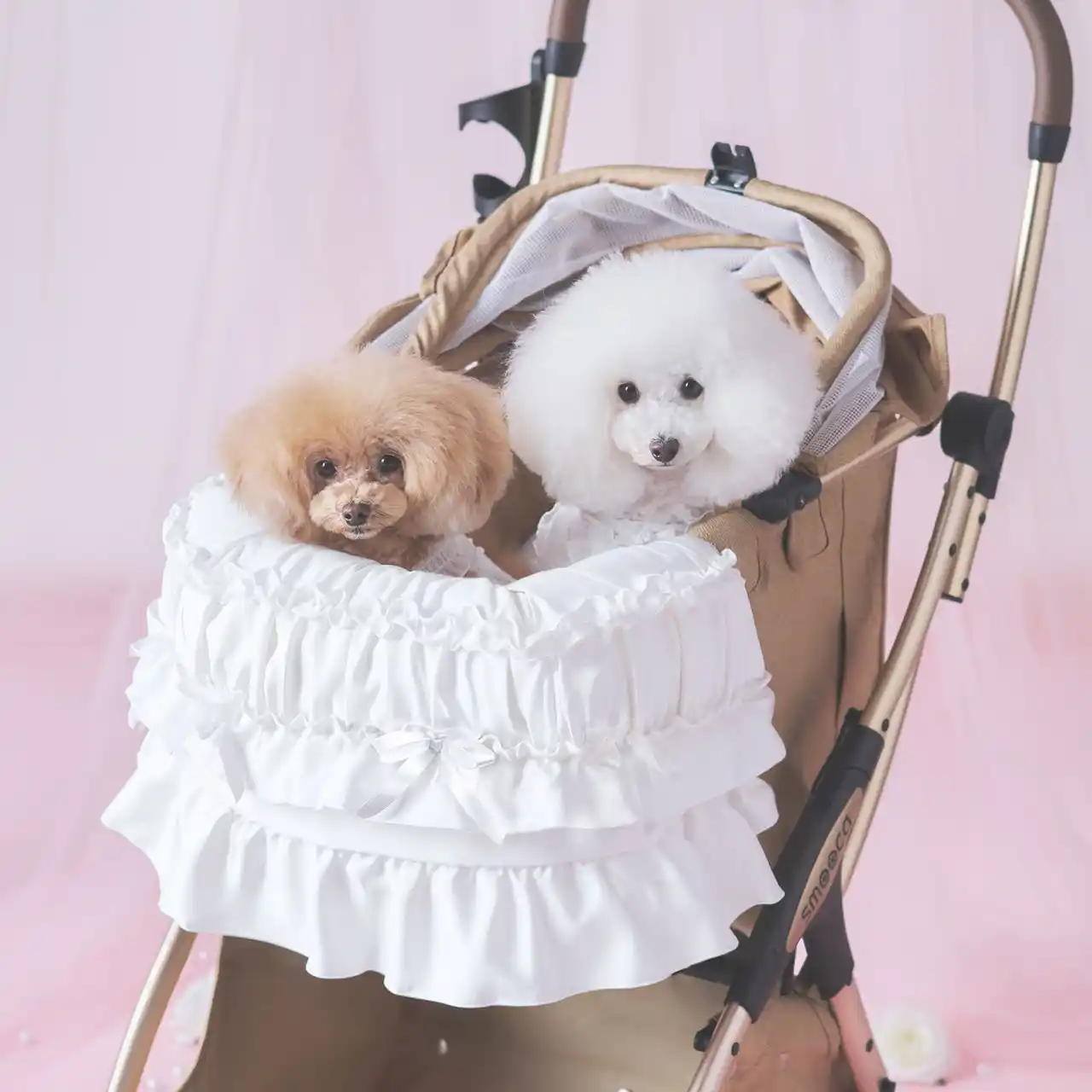 お散歩の時間をより快適にするアイテムとして、カート用クッションを初めて発売します。ギャザーやフリル、リボンをふんだんにあしらった贅沢なデザインです。リバーシブル仕様で、フリルが際立つ「フェミニンスタイル」と、小さなリボンをちりばめた「キュートスタイル」の双方をお楽しみいただけます。当社で展開しているペットカート「スムーカ」とも非常に相性の良いアイテムです。 |