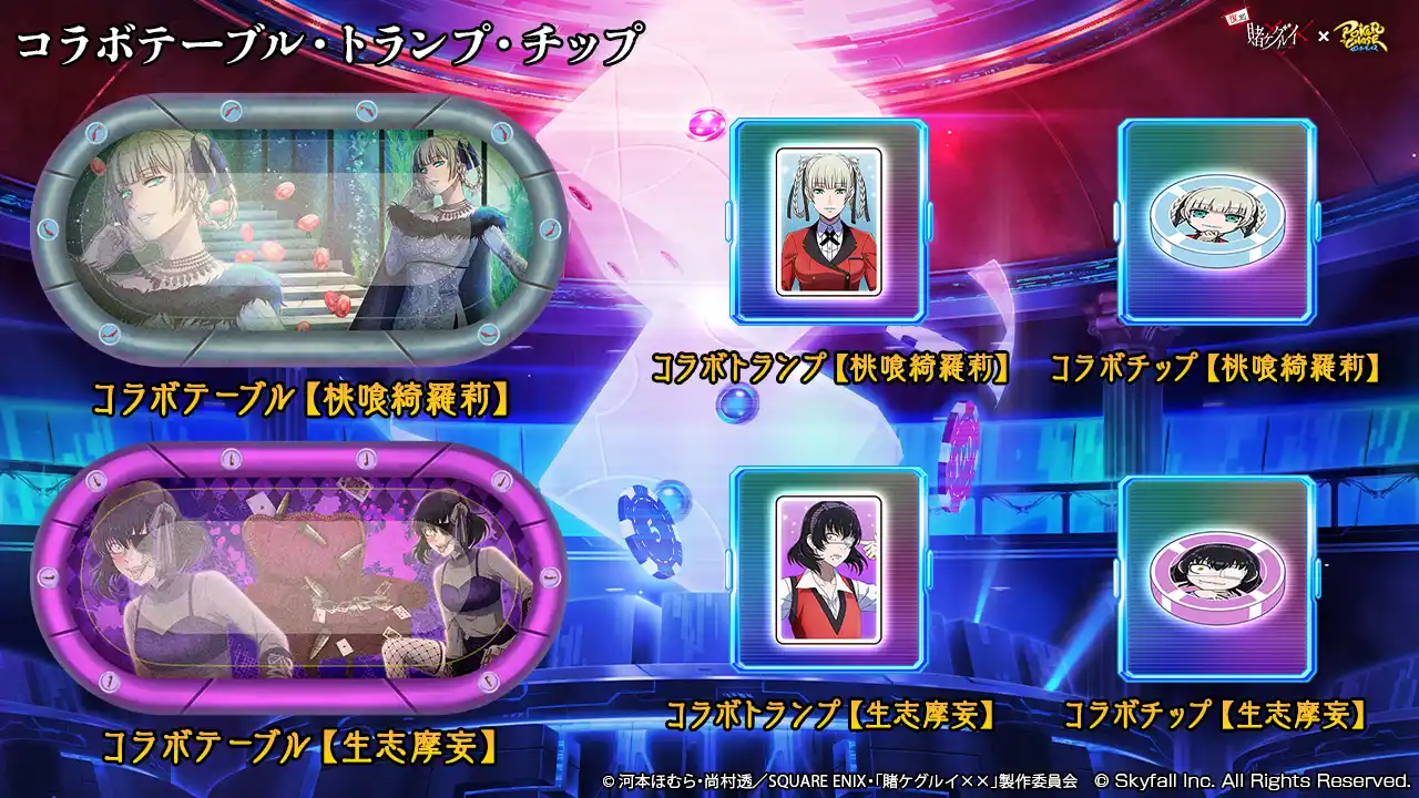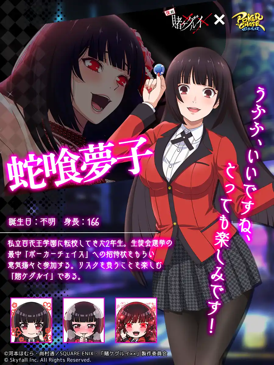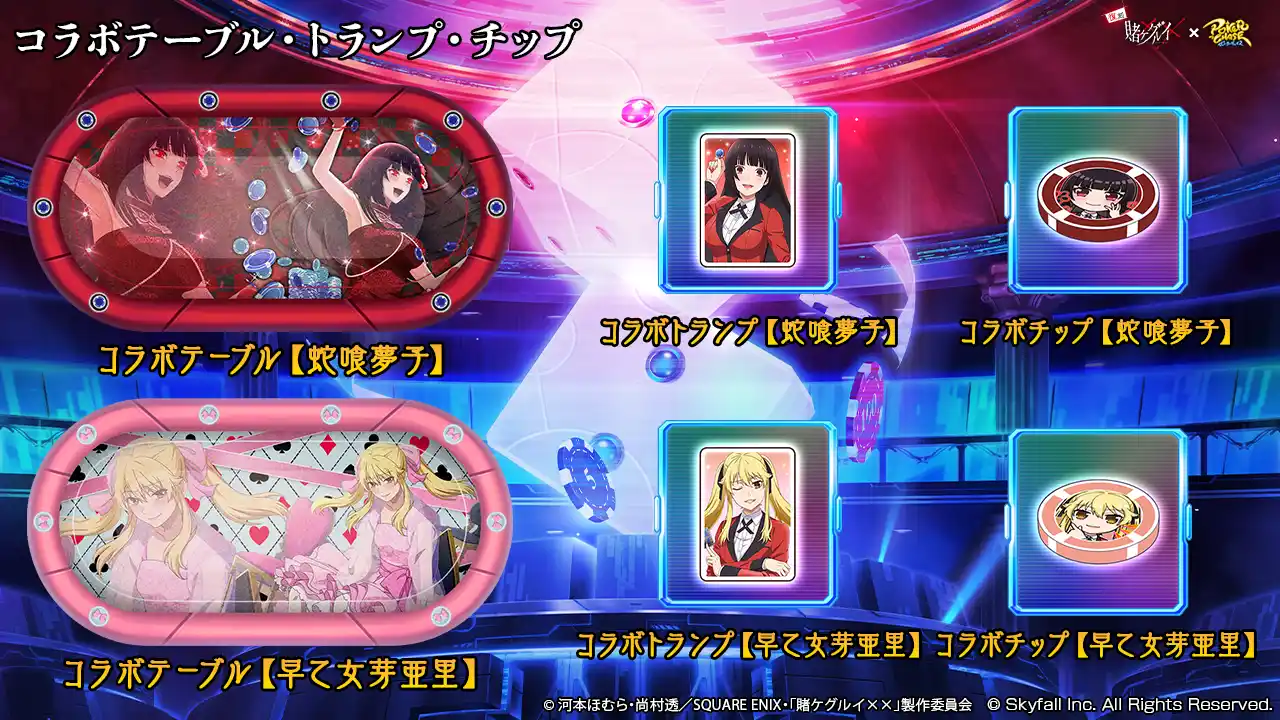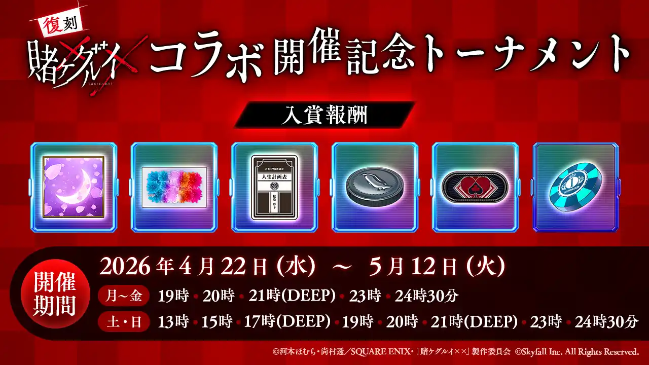 株式会社Skyfall(東京都港区 代表取締役社長:長谷川 智一、以下Skyfall)が運営するバトロワ式テキサスホールデムポーカーゲーム『ポーカーチェイス』は、TVアニメ「賭ケグルイ××」と、2026年4月22日(水)~ 5月13日(水)の期間限定でコラボイベントを復刻開催することが決定しました。 |