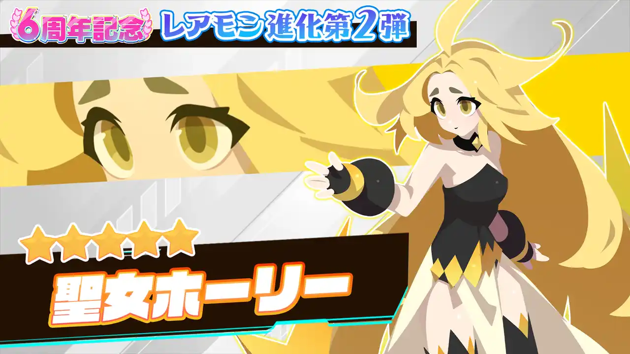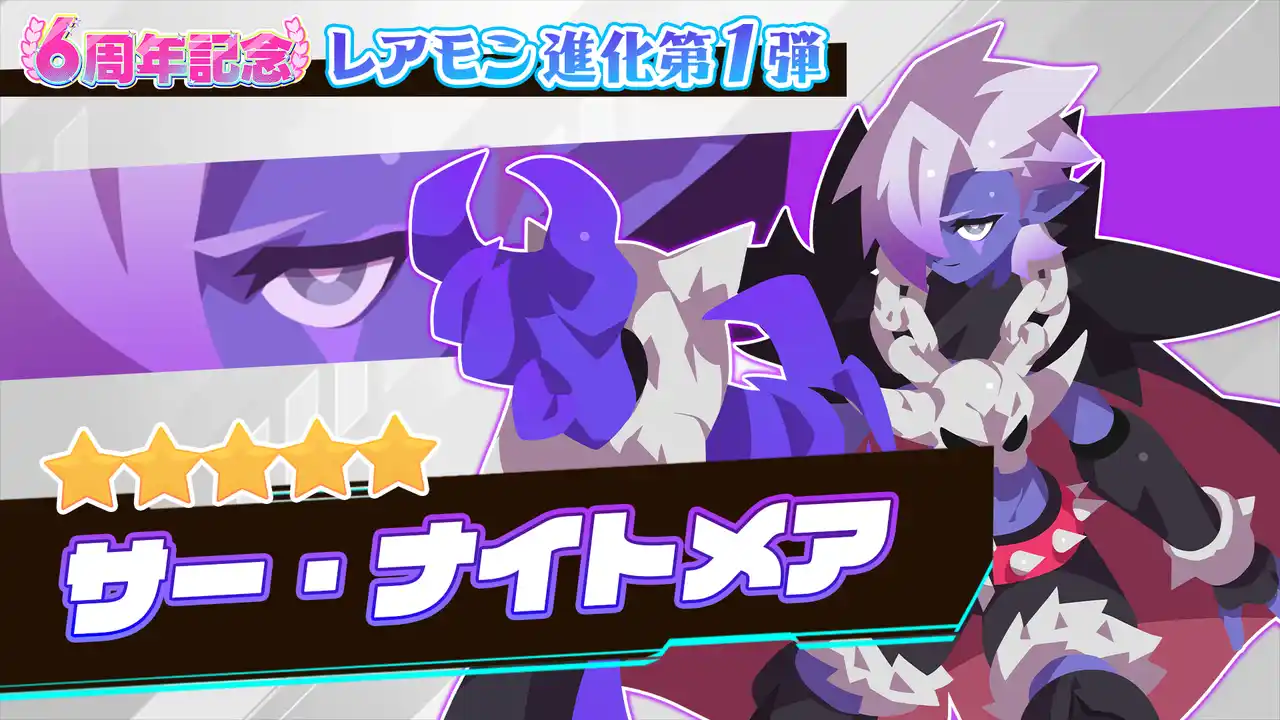 6周年を記念して、★5レアモン「サー・ナイトメア」の進化先に★6レアモン「[夢幻]サー・ナイトメア」と、★5レアモン「聖女ホーリー」の進化先に★6レアモン「[神光]聖女ホーリー」が追加されます。 |